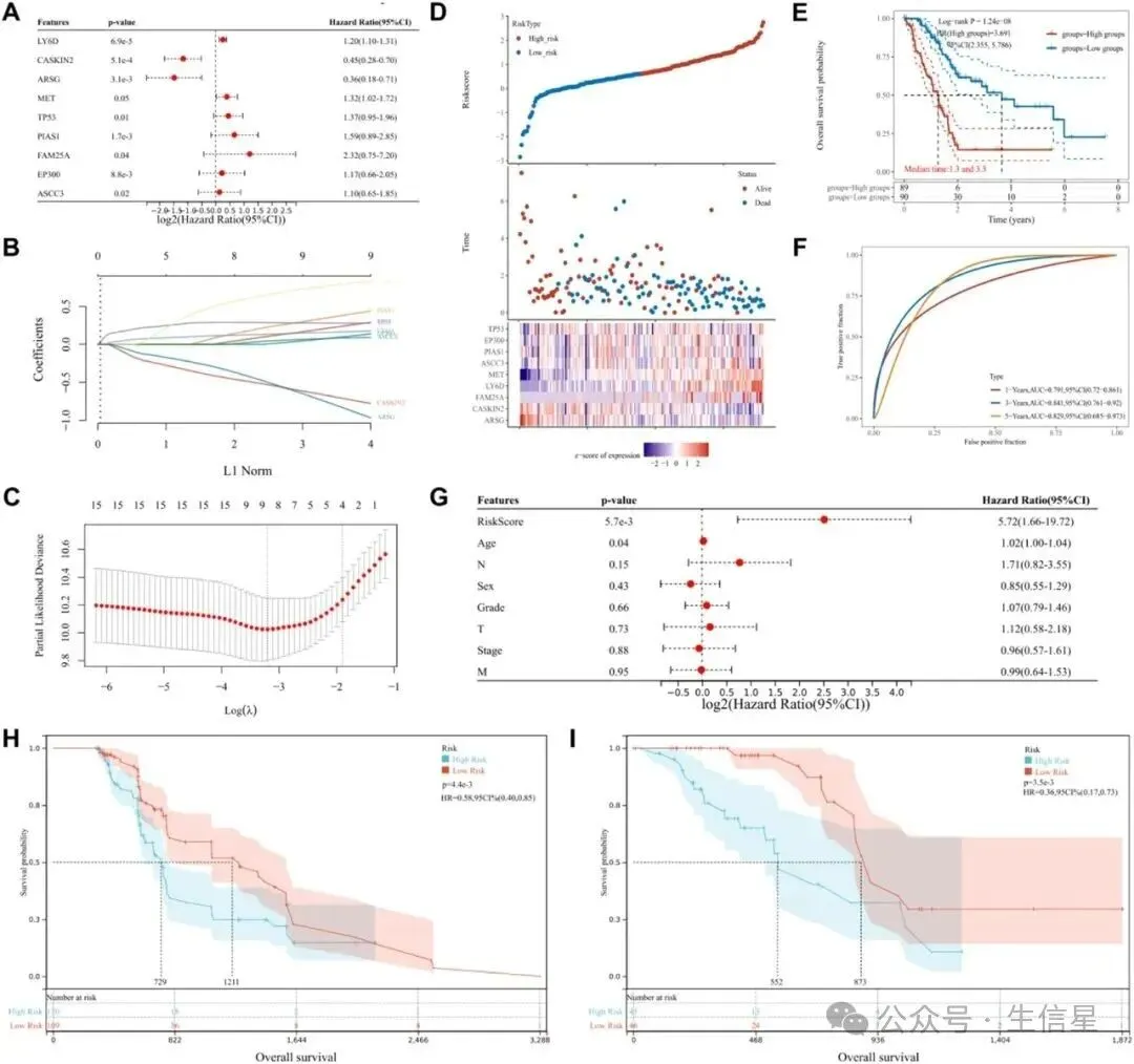 (2)基因风险模型构建:通过Cox回归分析评估20个关键基因的预后价值,发现其中9个基因(TP53、EP300、PIAS1、ASCC3、MET、LY6D、FAM25A、CASKIN2、ARSG)与OS显著相关,构建了风险模型。