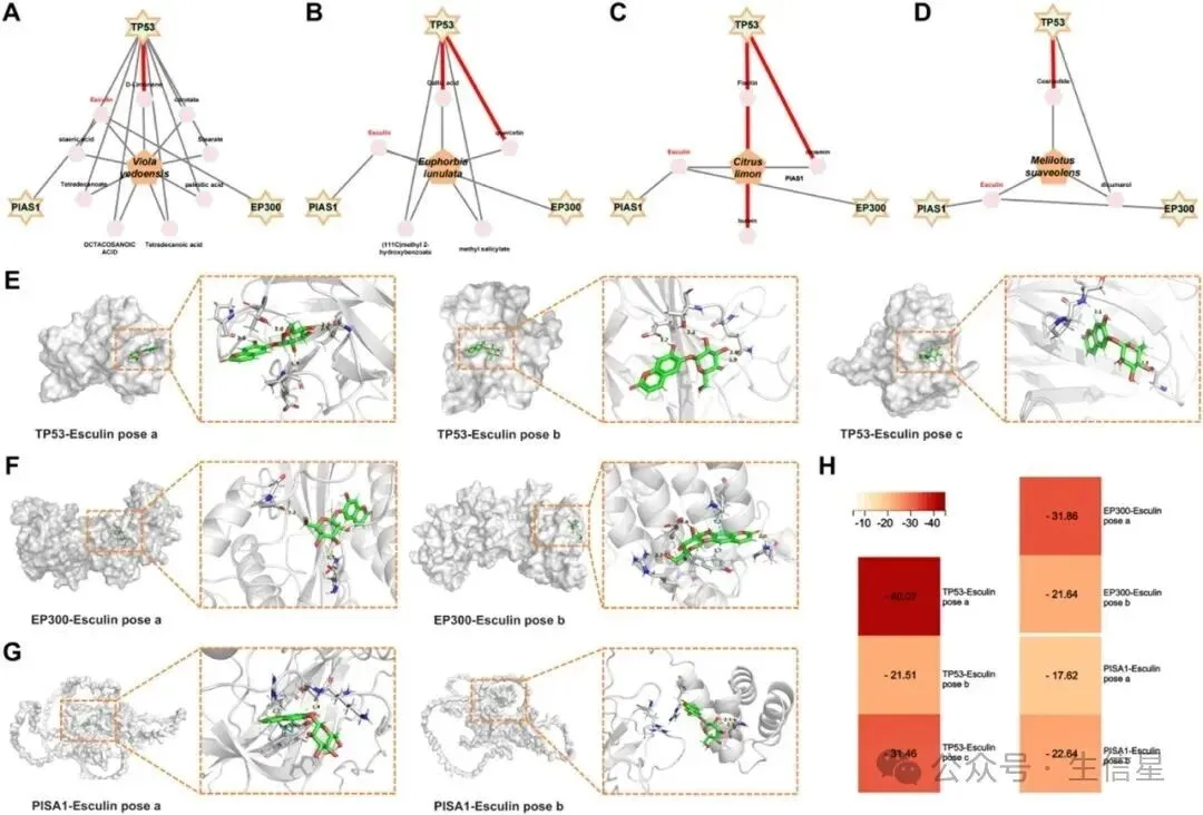 (3)网络药理学+分子对接分析:探究七叶内酯与关键基因编码的蛋白质(如TP53、EP300和PIAS1)之间的潜在靶向关系,构建了四种中药成分(Viola yedoensis、Euphorbia lunulata、Citrus limon、Melilotus suaveolens)与TP53、EP300、PIAS1蛋白之间的网络模型,发现这些中药成分与三个关键蛋白之间存在复杂的相互作用,表明它们可能通过多种途径影响PDAC的生物学过程。分子对接分析显示,七叶内酯对这三个关键蛋白均表现出较高的结合亲和力,表明其可能通过多靶点机制发挥抗PDAC作用。