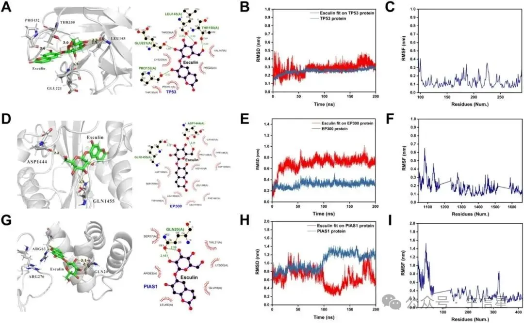 (4)分子动力学模拟:分子动力学模拟结果显示七叶内酯与TP53、EP300、PIAS1蛋白的结合在模拟过程中表现出良好的稳定性和热力学特性,具体的氢键相互作用和残基灵活性分析进一步证实了七叶内酯与这些关键蛋白结合的稳定性和潜在作用机制。