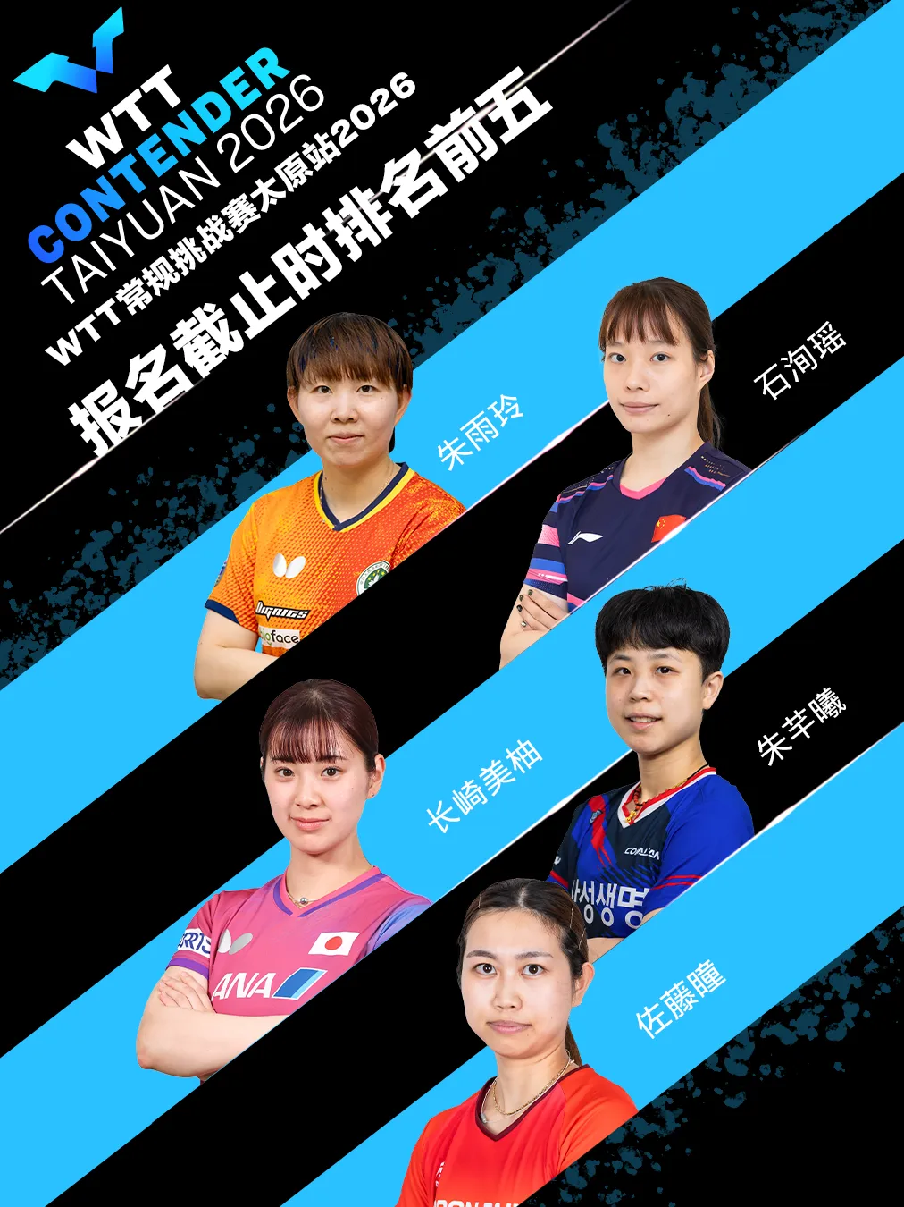 WTT常规挑战赛太原站2026将于4月7日至12日,在太原滨河体育中心体育馆举办,冠军将获得400点世界排名积分。报名截止时排名前五名单如下: