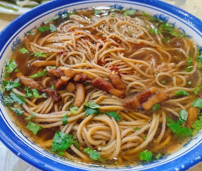 面条是现压的,粗细均匀,煮得透透的,捞进碗里,浇上厚厚的肉臊子。一定要加一勺当地的陈醋,拌开了,酸香扑鼻。咬一口,面条筋道,肉丁在嘴里爆开油香,热气顺着喉咙下去,胃里瞬间就踏实了。