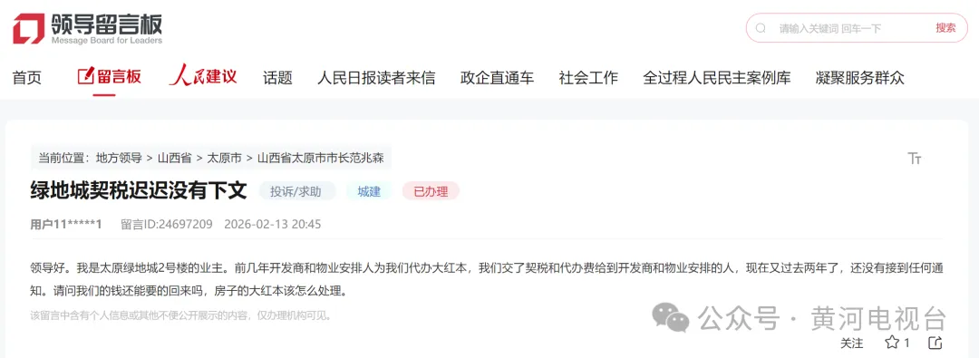 记者从人民网领导留言板获悉,太原市绿地城2号楼的业主反映:前几年开发商和物业安排人为业主代办大红本,业主交了契税和代办费给到开发商和物业安排的人,现在又过去两年了,还没有接到任何通知。