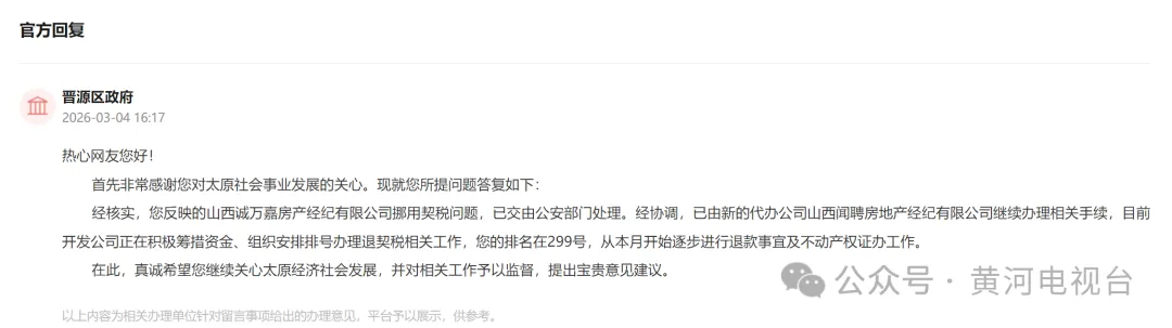经核实,您反映的山西诚万嘉房产经纪有限公司挪用契税问题,已交由公安部门处理。经协调,已由新的代办公司山西闻聘房地产经纪有限公司继续办理相关手续,目前开发公司正在积极筹措资金、组织安排排号办理退契税相关工作。