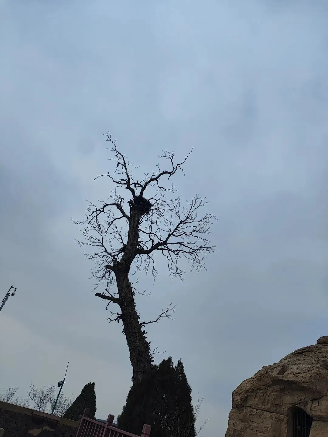 今日带着孩子外出春游,快走到石窟时,看到一颗没有树叶的枯树。