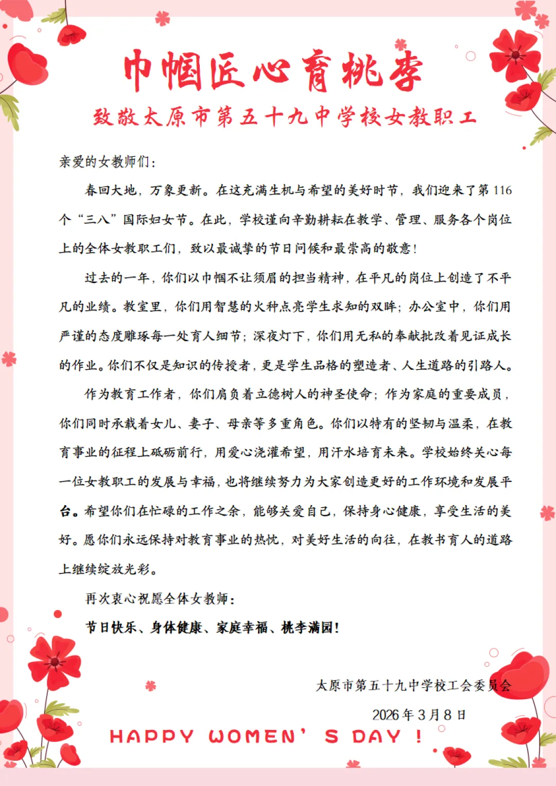 太原市第五十九中学校致全体女教职工的三八妇女节慰问信
