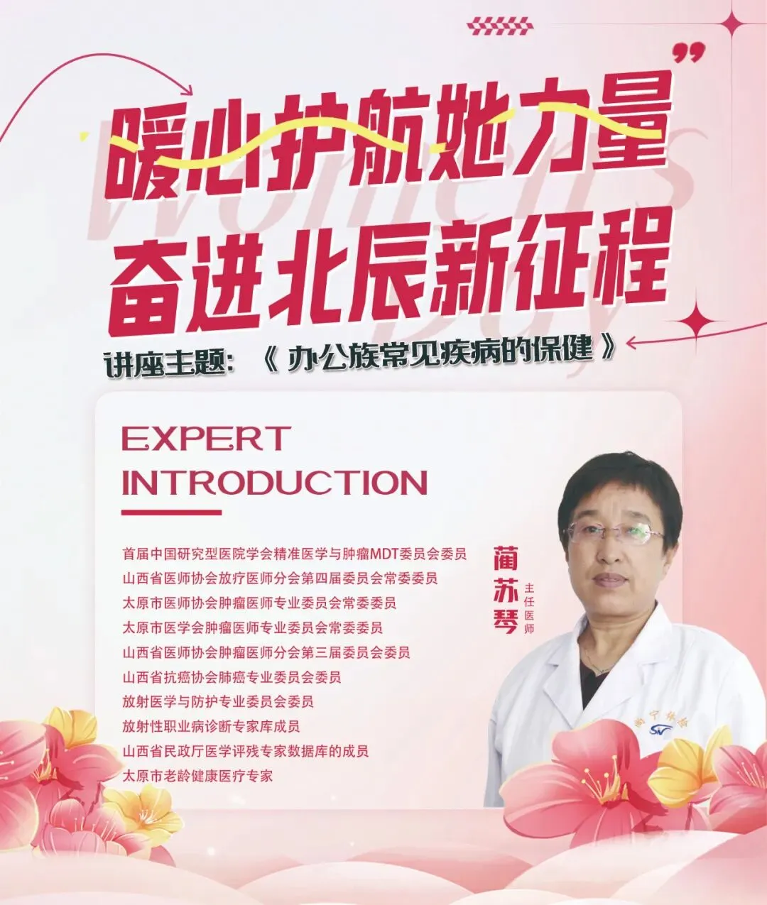 此次活动特别邀请到首届中国研究型医院学会精准医学与肿瘤MDT委员会委员、太原市老龄健康医疗专家蔺苏琴主任医师,带来《办公族常见疾病的保健》专题讲座,为大家送上一份贴心的“健康大礼”。
