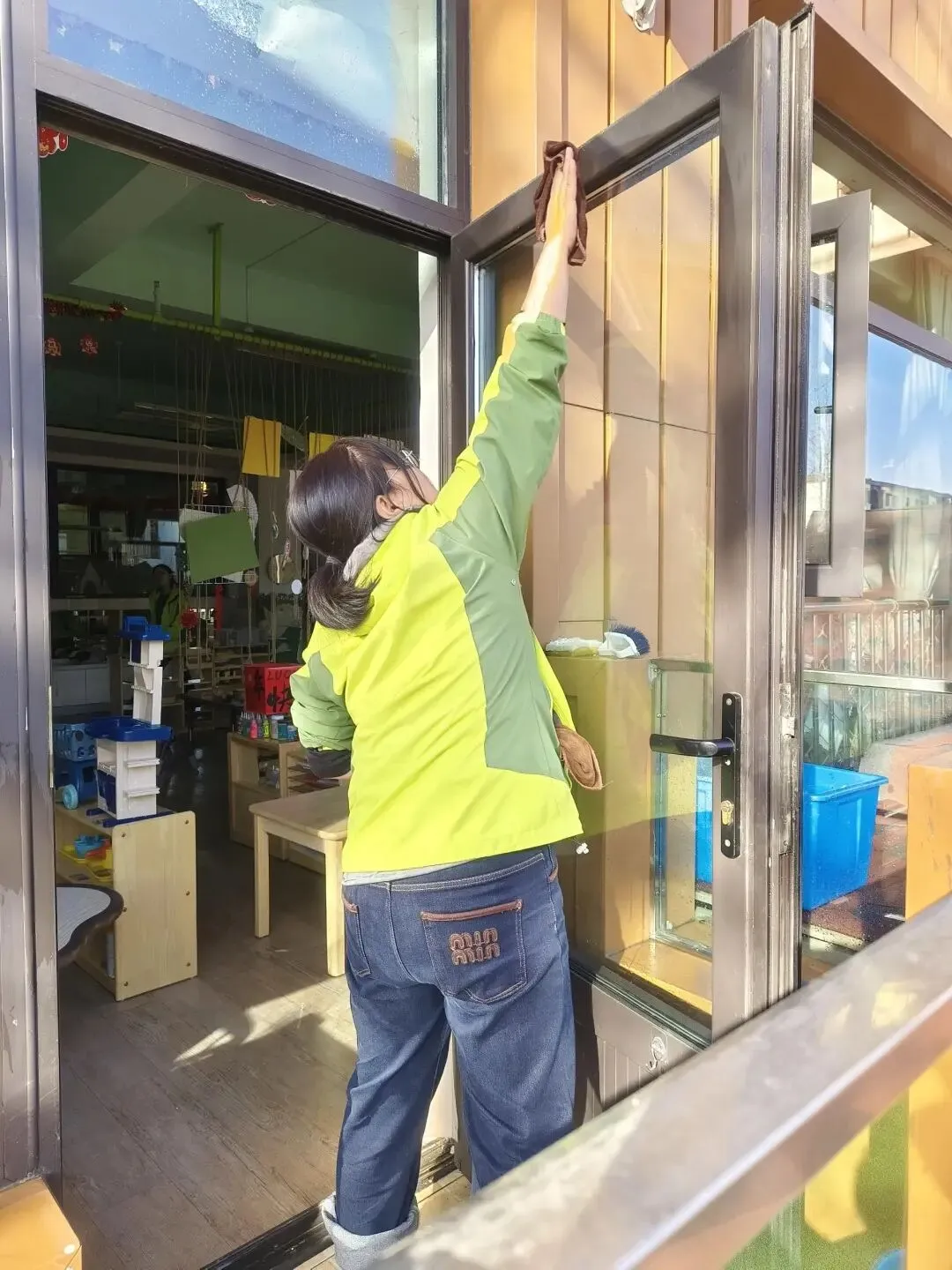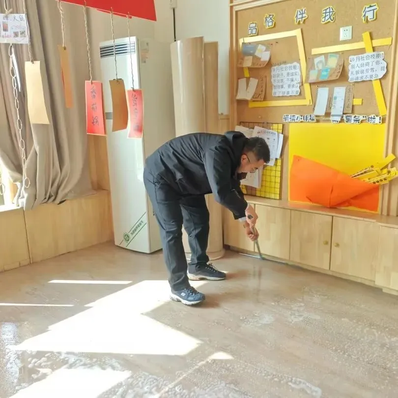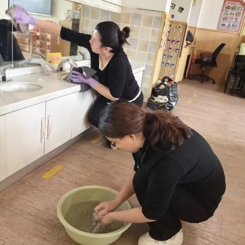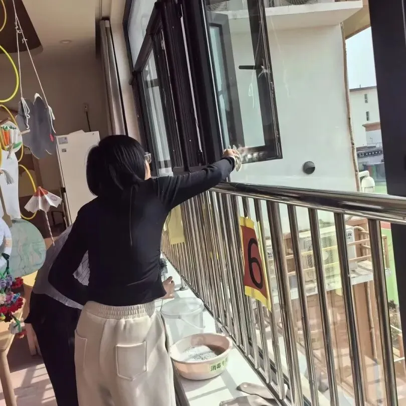 户外是孩子们奔跑、嬉戏的天地,大型滑梯、攀爬架、小黄车……每一件器械都承载着孩子们的欢乐。为了让这些“大玩具”以最洁净的面貌迎接宝贝,老师们化身“清洁卫士”,对户外活动区域进行了全方位、无死角的清洗与消毒。