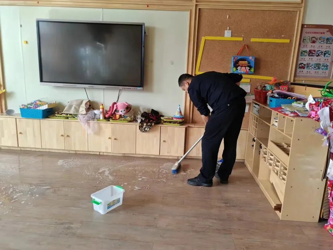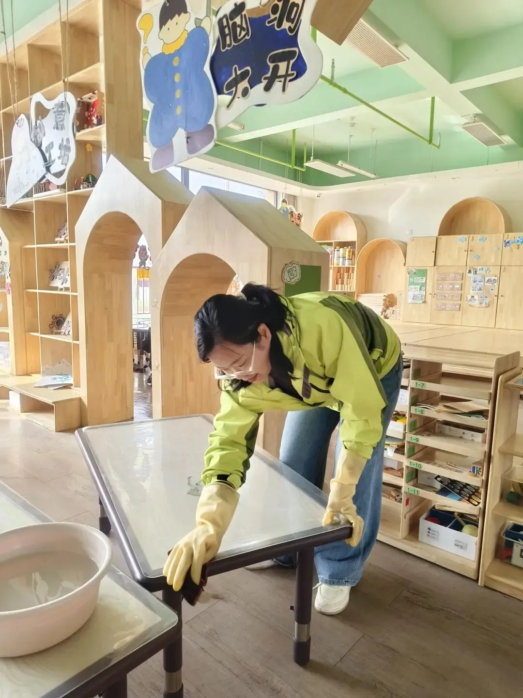 教室是孩子们在园期间最主要的活动场所,每一个角落都关乎健康。老师和家长志愿者们严格按照卫生消毒标准,对室内环境进行了“地毯式”清理。