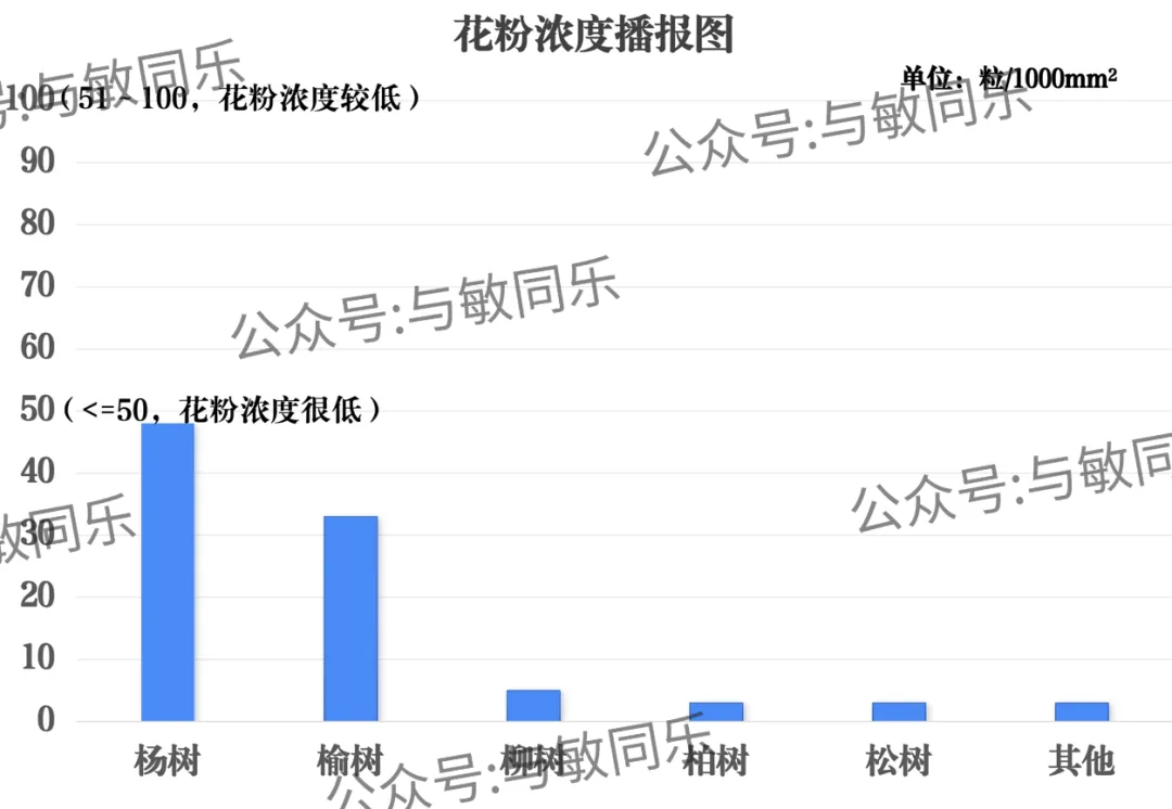 杨树、榆树、柳树、柏树、松树花粉浓度为很低。