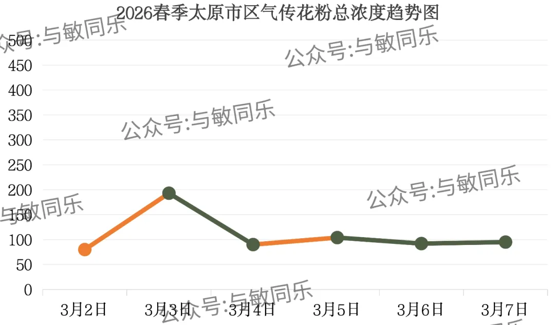 3月7日早8点至3月8日早8点:花粉总数在51~100(粒/1000mm²)之间,花粉总浓度为二级(花粉浓度较低)。
