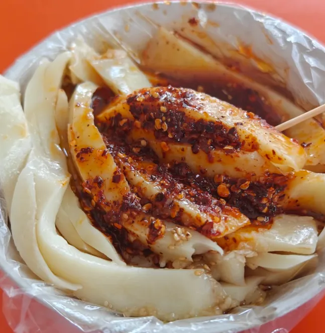 特别推荐试试“碗团”。这东西看着不起眼,一小碗荞麦面做的冻。拿小刀划拉成菱形块,浇上特制的辣椒油和陈醋。入口是凉的,滑溜溜地钻进喉咙,紧接着辣味和酸味在舌尖上炸开,嚼起来韧劲十足。夏天吃解暑,冬天吃过瘾,是那种很实在的民间滋味。