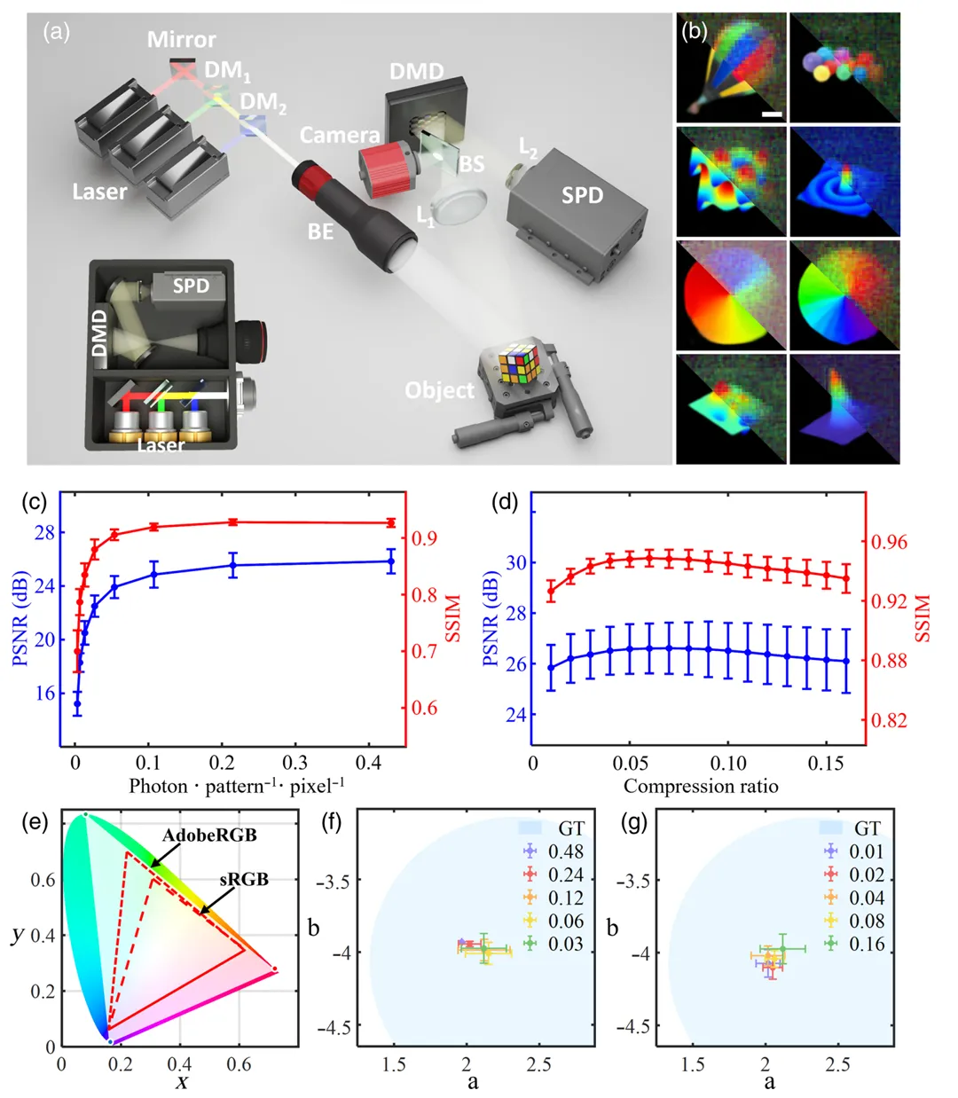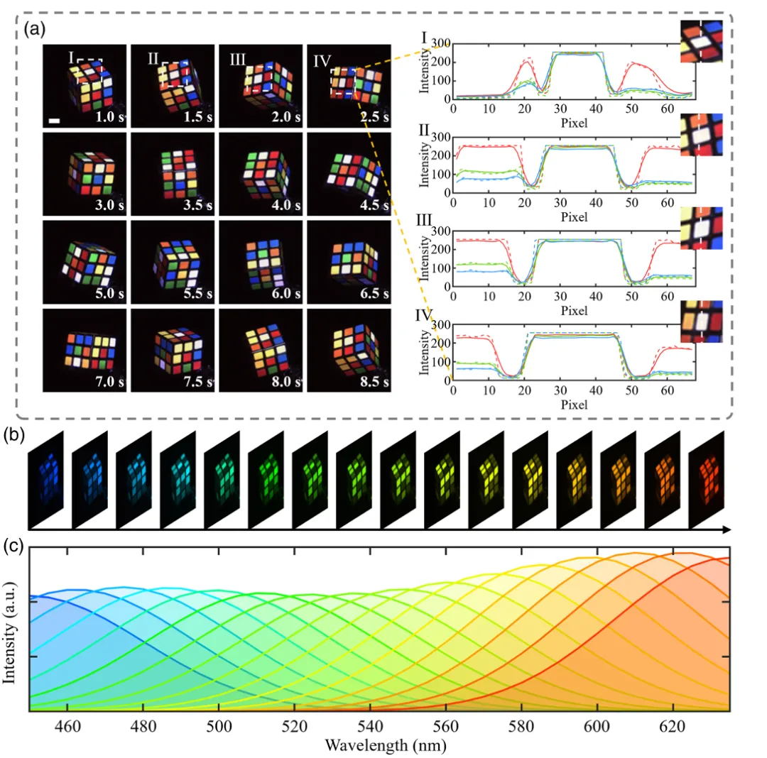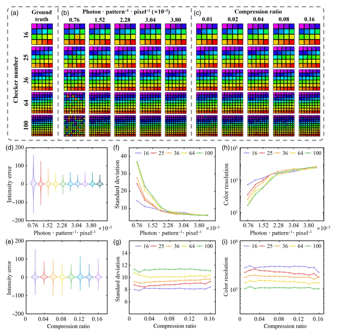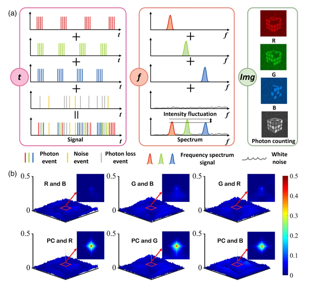 太原理工大学肖连团教授、卞耀兴副教授团队提出了一种面向光子匮乏条件的高保真单光子全彩色成像技术。该技术设计利用跨通道相关方法,将从频谱谐波中提取的颜色通道与光子计数通道进行融合,从而实现噪声抑制、信息互补与颜色比率校正。实验结果表明,该技术能够实现每像素区分超过4500种颜色的全彩色成像,在实现超宽带色域的同时,将整体色差控制于人眼感知阈值以下,达成高保真全彩色重建。此外,该技术还利用光子统计的随机性实现了频域压缩感知,显著降低解调所需的光子数量,使得在单像素单光子接收条件下,仍能达到每秒32帧的动态成像帧率。