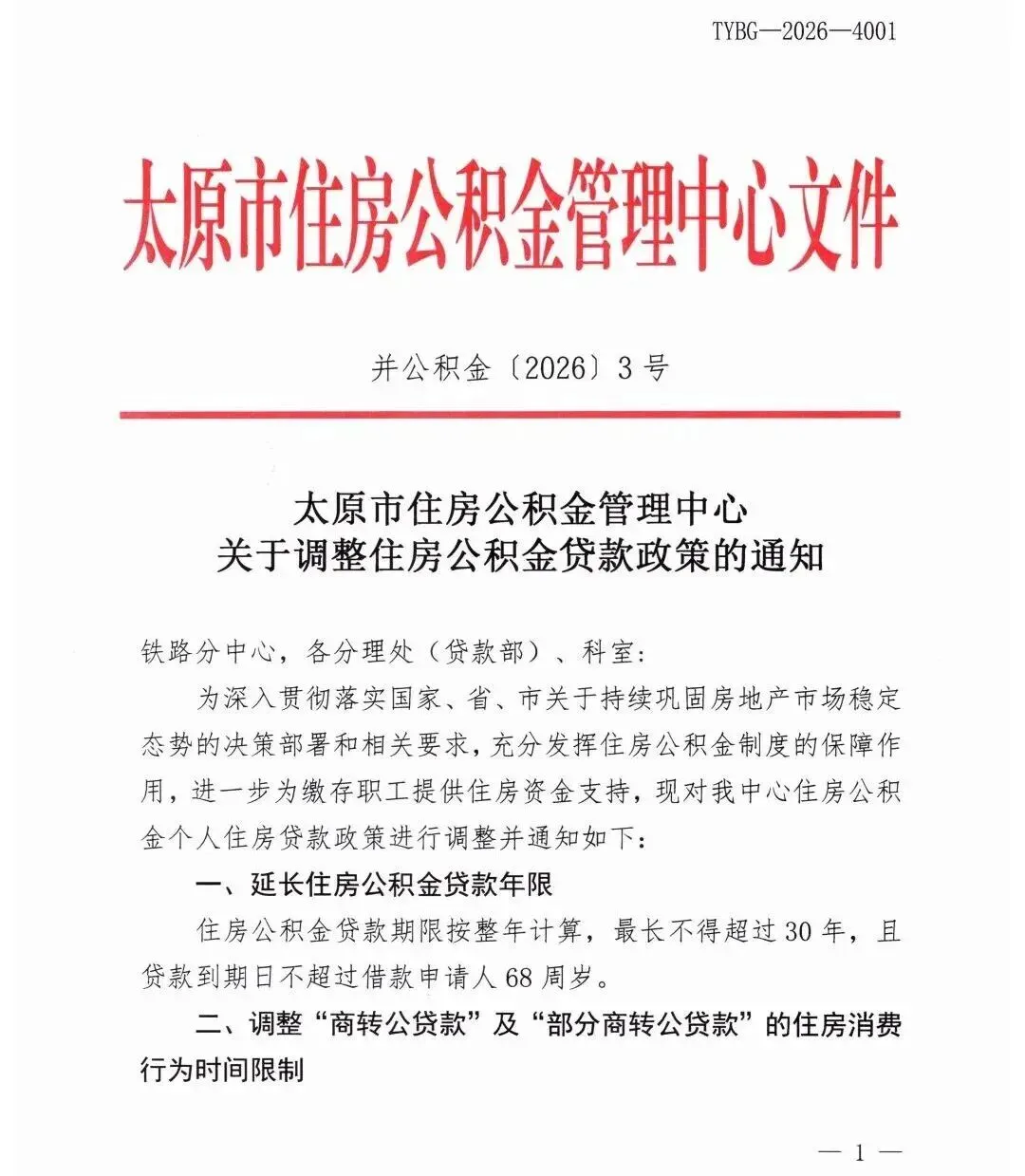 2026年3月4日,太原市住房公积金管理中心发布了关于调整住房公积金贷款政策的通知。此次政策调整为太原市民带来了多项重磅利好: