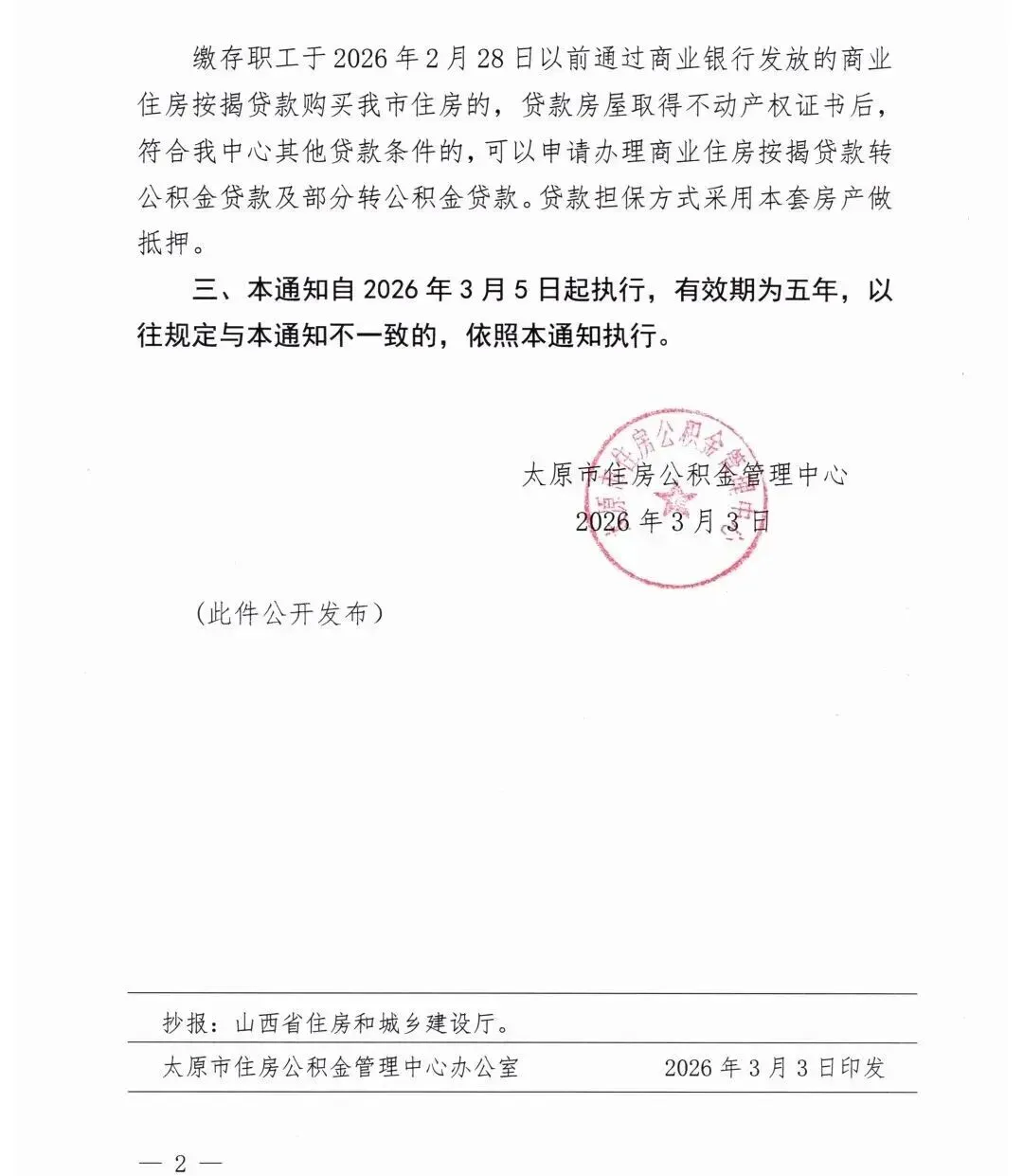 另一项重要调整为,进一步放宽“商转公贷款”及“部分商转公贷款”的住房消费行为时间限制,由此前的2024年3月1日前调整为2026年2月28日以前通过商业银行发放的商业住房按揭贷款购买太原市住房的,贷款房屋取得不动产权证书后,符合中心其他贷款条件的,均可申请办理商业住房按揭贷款转公积金贷款及部分转公积金贷款。