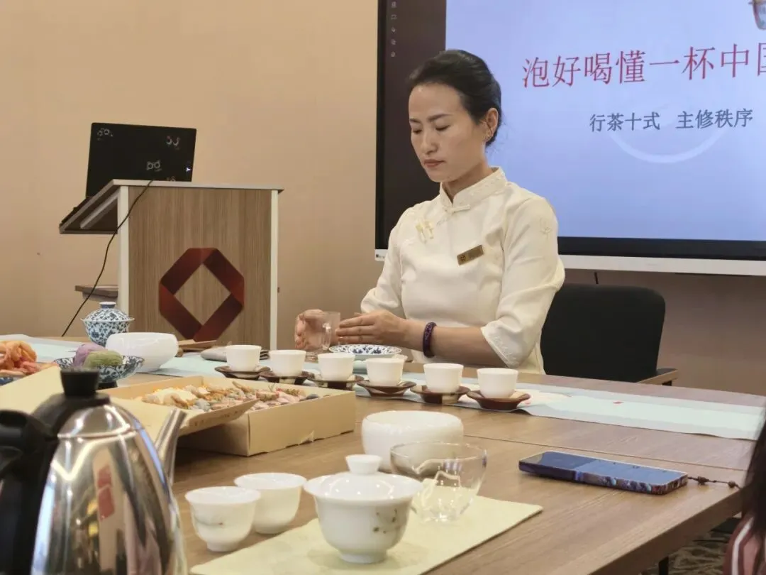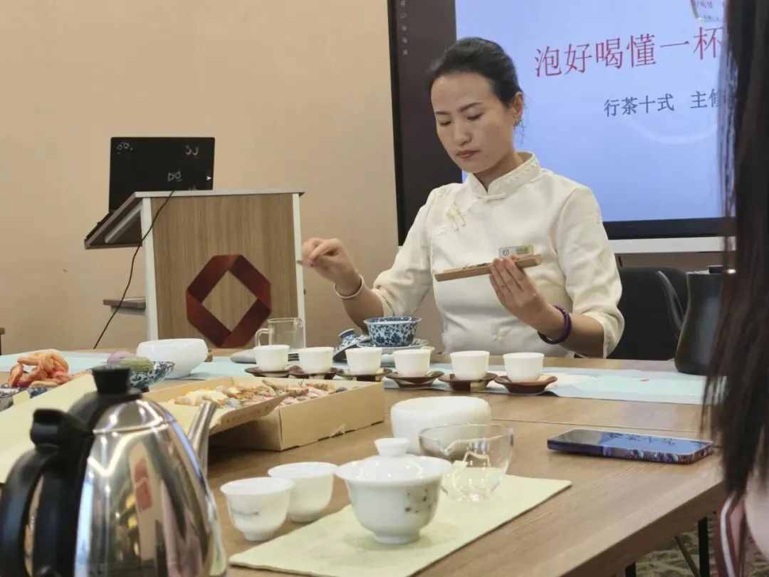 理论之后,谭老师现场演示了**行茶礼仪**与**行茶十式**。温杯、投茶、润茶、冲泡、奉茶……每一个动作都蕴含着“敬、静、净”的东方哲思。在老师的指导下,大家亲手尝试行茶流程,从专注的眼神到轻柔的指尖,无不流露出对这份仪式感的尊重与投入。茶香袅袅间,工作的疲惫悄然散去,内心的宁静油然而生。