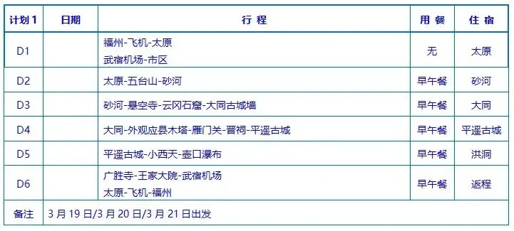 // 重要提示 //1.山西为大陆性季风气候,早晚温差较大,空气较为干燥,请提醒来访客人多喝水多食水果。2.山西本地饮食习惯以面食为主。山西菜的基本风味以咸香为主,甜酸为辅,菜肴可分为南、北、中三派。南路以运城、临汾地区为主,菜品以海味为最,口味偏清淡。北路以大同、五台山为代表,菜肴讲究重油重色。中路菜以太原为主,兼收南北之长,选料精细,切配考究,山西菜具有酥烂、香嫩、重色、重味的特点。3.山西饮水碱性较大,请适量食用山西特产老陈醋,不仅可中和水内碱质,还可增强体质,预防感冒,更有美容的奇特疗效。4.出行必备:雨衣或雨伞、运动鞋、感冒药、肠胃药、防虫膏药、防晒油、太阳帽、太阳镜等。5.山西是中华文明的发祥地之一,有着深厚的历史文化底蕴,敬请各位游客入乡随俗,遵从各地风俗。6.山西地上古建筑及珍贵文物众多,敬请游客爱护古建,珍惜文物。7.山西景区之间的时间较长,请大家做好准备。8.山西旅游开发较晚,各项基础设施及接待条件比发达地区还有差距。9.酒店大堂、房间、洗手间及餐厅多为光滑地面,行走时请注意脚下,避免摔倒。10.酒店退房时间为中午的12:00,晚班机的客人可把行李寄存在酒店后自由活动或自补房差开钟点房休息。11.行程中所含早餐均为住宿酒店提供,包含在房费中,不用不退。12.在不减少景点数量及游览时间的前提下,旅行社可与游客友好协商,根据实际情况调整游览顺序。13.行程中标注的景点游览时间是根据旅游正常情况来约定的,为抵达景区大门始至离开景区大门止;原则上淡季人不多的时候前面标注的游览时间都能够确保游客充分将景点游览完毕。关于行程上约定的城市之间景点之间的车程时间以无特殊情况(如堵车、下雨、下雪、修路或意外等)特殊状况出现为标准来测算的时间,如有任何一种情况发生都有可能造成时间的变化,请各位游客理解。14.行程结束后自由活动期间,请注意自身人身财产安全,切记单独行动,不要盲目听信的士车司机的话。在此期间经游客主动要求或经协商一致,签署补充协议,我社可安排其他另付费特色体验项目。15.由于有关环保法律和政策要求,自由活动期间旅游大巴停运,期间可能不会开放车内空调。16.旅程结束时,请认真如实地填写旅行社提供的《游客意见反馈表》,希望通过您的意见单我们更好地监督当地的接待质量,您的意见单也将是行程中发生投诉的处理依据!恕不受理客人因虚填意见单而产生的后续争议和投诉,由此而造成的一切损失由客人自负。投诉问题在旅游目的地就地解决,返程后我社将不接受投诉,请谅解,谢谢!