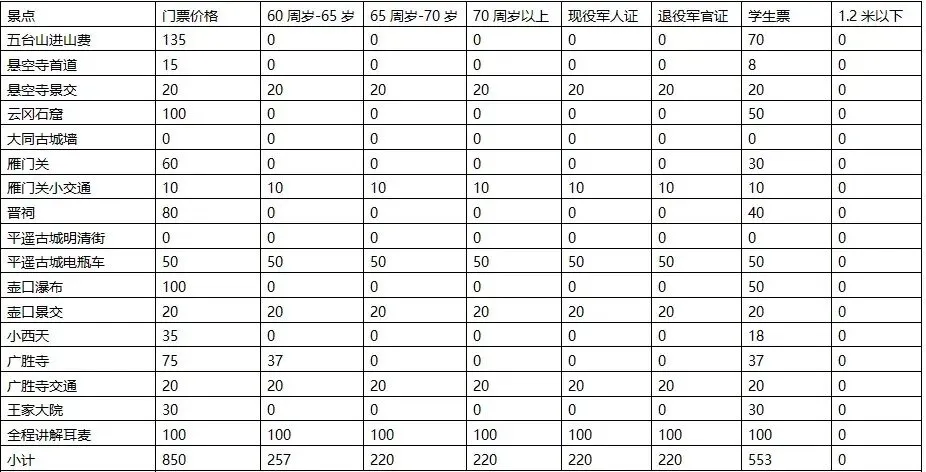 平遥古城套票(非必须)125元/人,60周岁以上可享受免票