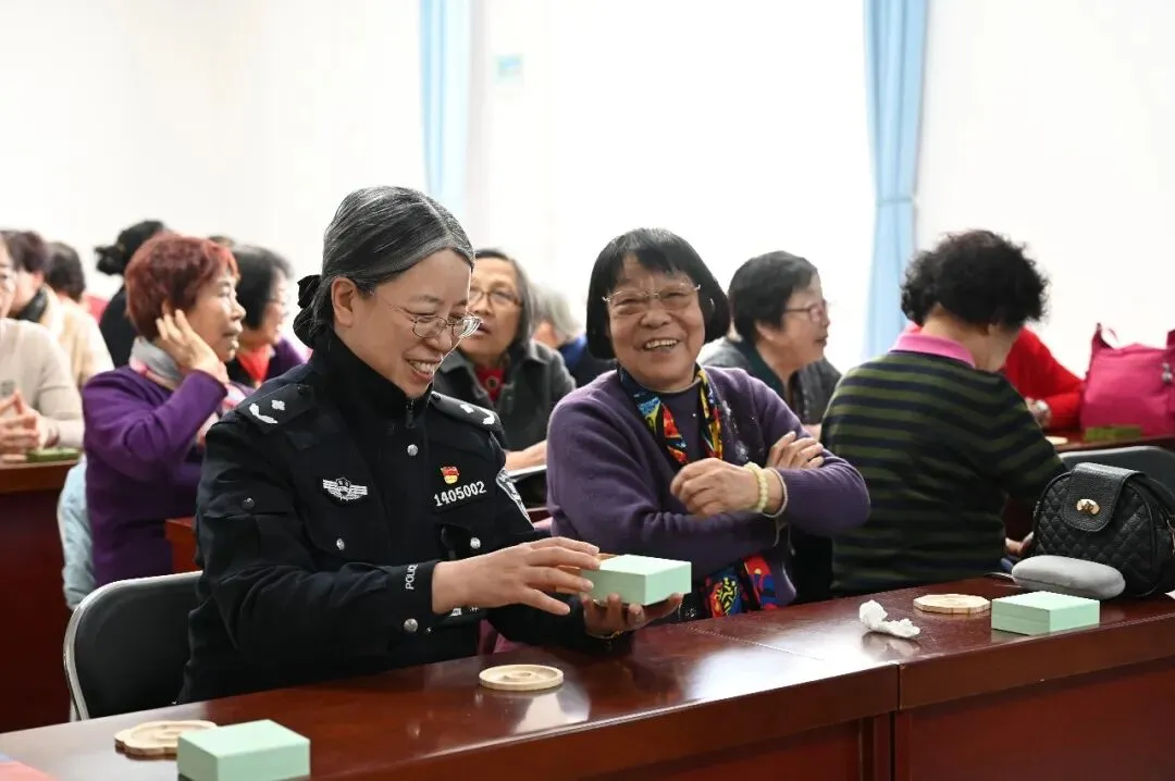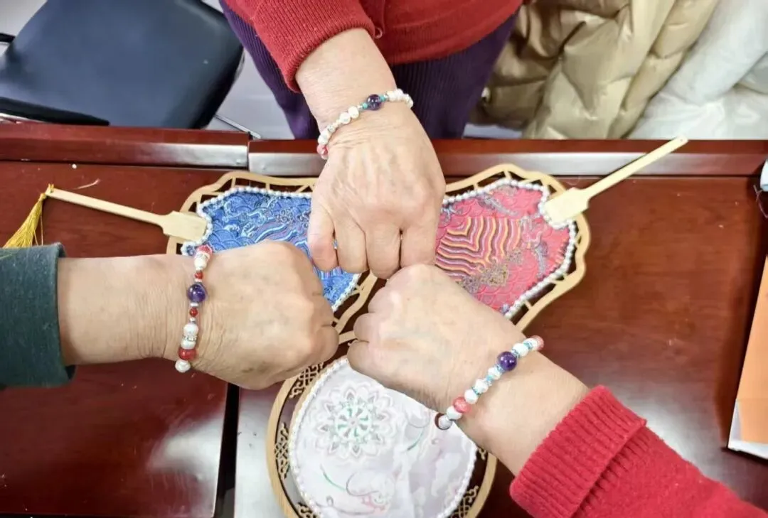 手工制作环节,老同志们兴趣盎然、积极参与。珍珠手串制作中,大家精心挑选珠饰、搭配颜色、穿珠成链,不一会儿,大大小小的珠子就在大家的巧思中变成了一串串温润雅致的手串;宋锦扇制作现场,非遗宋锦的典雅与珍珠的温润相得益彰,老同志们凝神细作、一丝不苟,把对生活的热爱融入到一把把精心制作的团扇中。