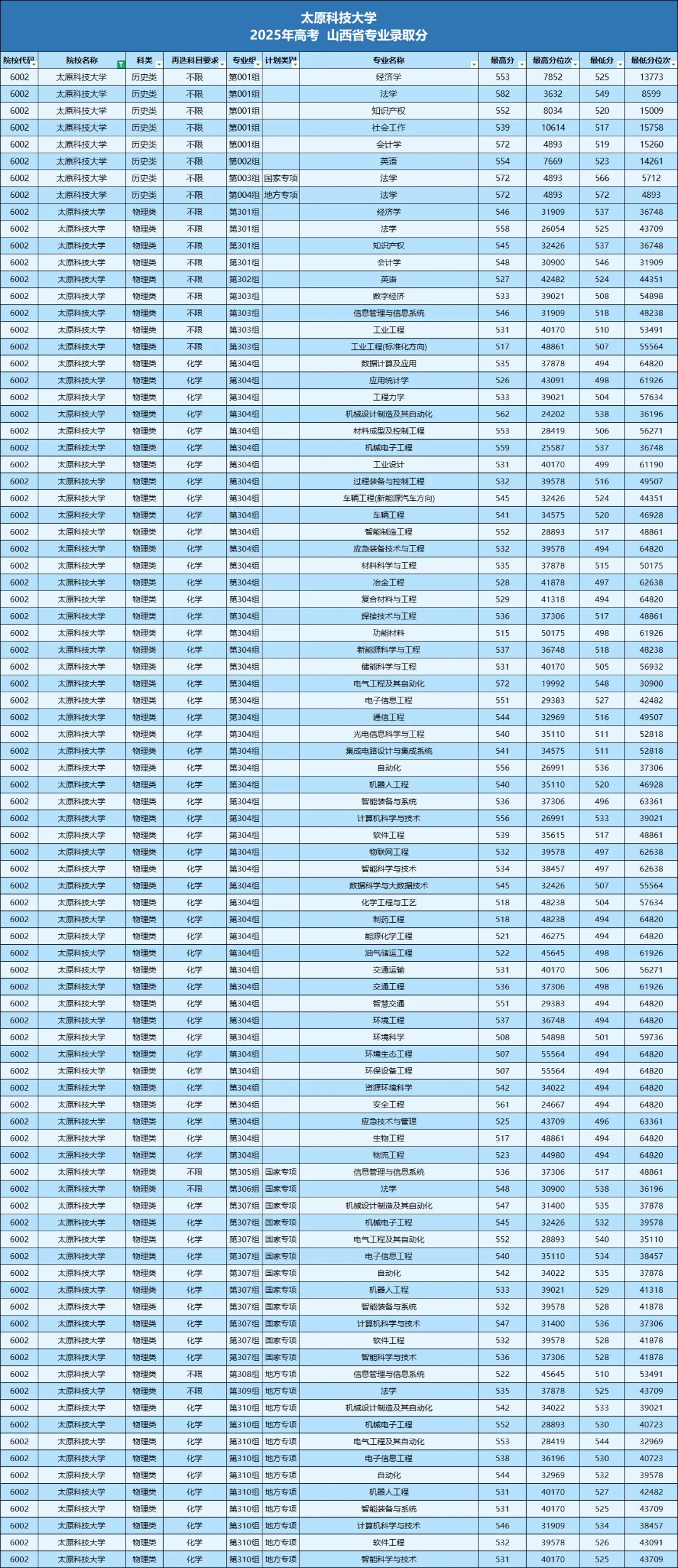 2025年在晋 专业录取分