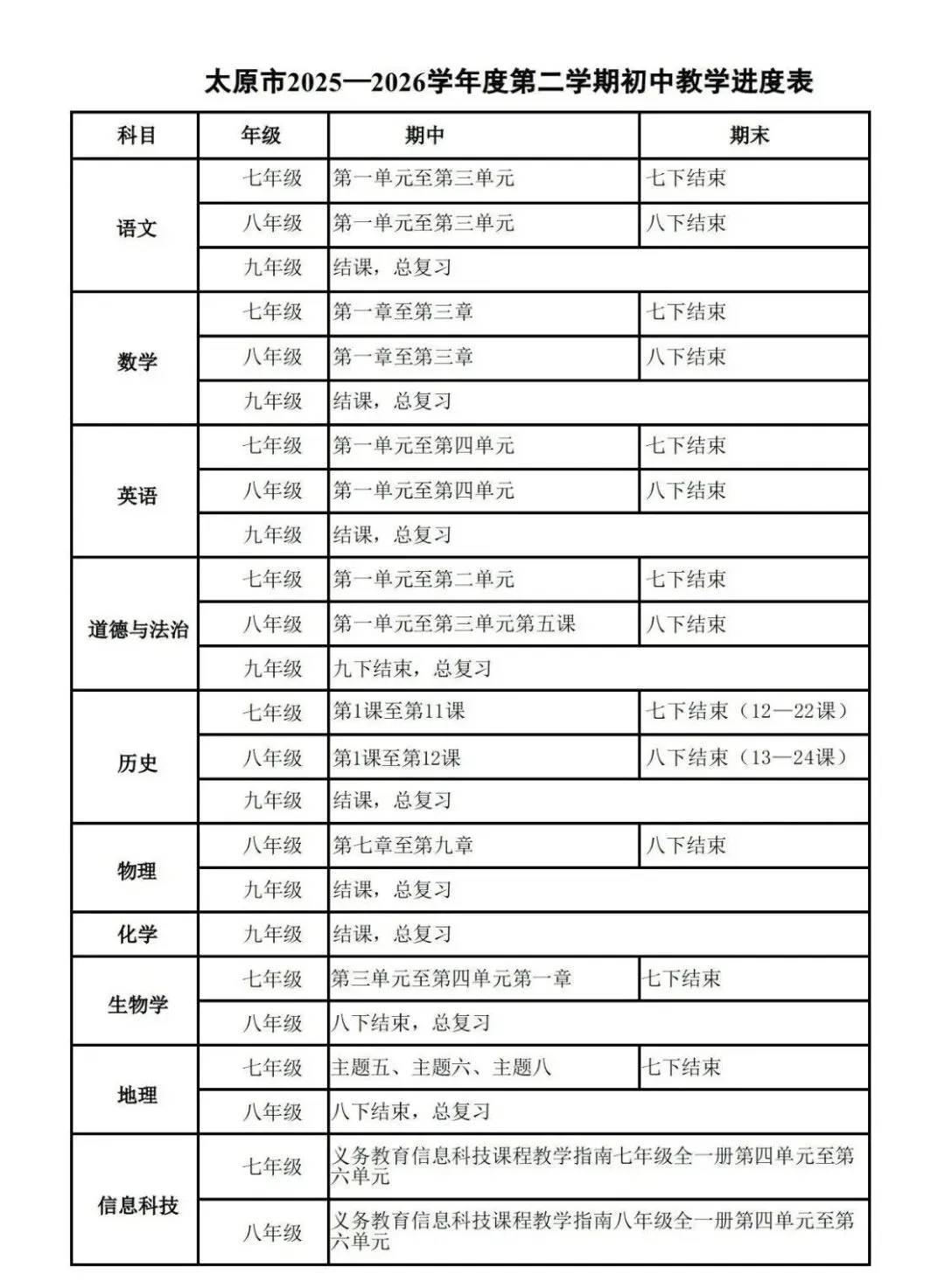 >【重点关注】太原市2025-2026学年度第二学期初高中各年级教学进度表