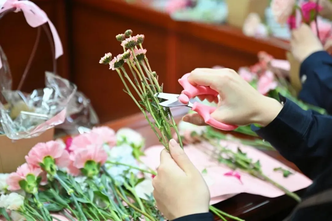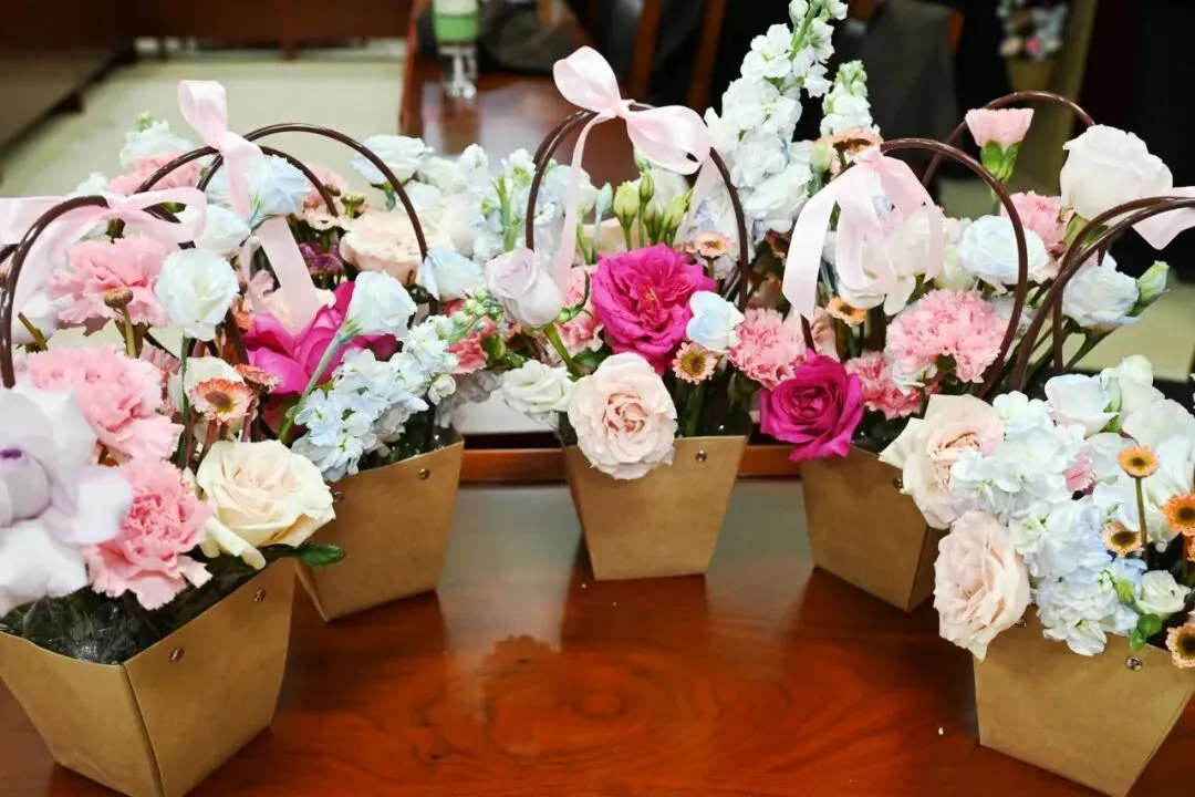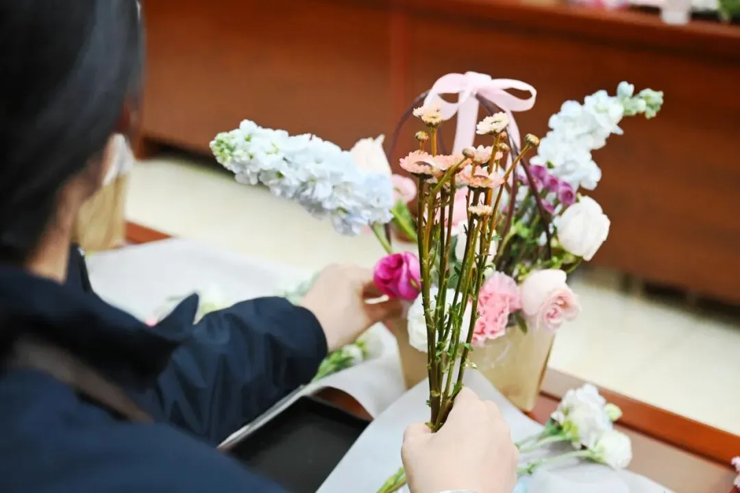 在老师的悉心指导下,大家兴致盎然、精心构思,修枝剪叶、搭配层次,将一朵朵鲜花错落有致地插入花篮。原本普通的花材在大家的巧手雕琢下,逐渐变成了一件件色彩绚烂、独具匠心的花艺作品。