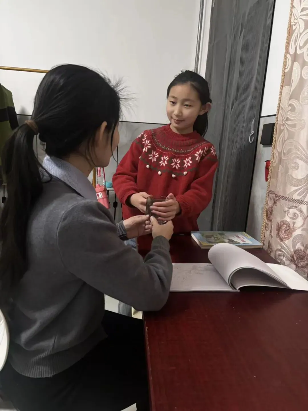 三、四年级开展“一件感恩事·温暖女神心”实践活动。孩子们主动为家中女性长辈捶背、倒水、扫地、洗碗,用实际行动践行感恩。照片中,有的孩子踮起脚尖为奶奶捶肩,有的小心翼翼地端着水杯递给妈妈,画面充满温情。“通过劳动,孩子们更懂得了长辈的辛劳,也学会了用行动表达爱。