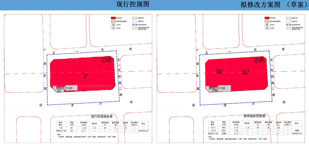 目前,迎泽大街地铁1号线沿线已经有多个商业综合体。比较知名的是下元商圈的公园时代城、下元商贸城,以及柳巷商圈的铜锣湾国际购物中心;还有与融恩星光荟签约的太原第二座吾悦广场(未开业)、央企中海规划开发的中海环宇城(未开业)。3月4日,太原市规划和自然资源局网站发布了《YZ-02片区02街区115等地块控制性详细规划修改方案(草案)》,为推进五一广场周边品质提升,对YZ-02片区02街区115等地块进行调整,具体如下:位置:北起五一东街,南至迎泽大街,西起广场东路,东至五一东街南二巷,总面积 3.04公顷(45.6亩)。1)用地性质优化,指标大幅下调:西侧地块容积率由5.0降至2.5,建筑限高≤20 米,建筑密度50%,绿地率≥20%。2)道路红线调整,规划指标重新赋值,旨在提升五一广场周边品质。该地块位于五一广场东北角核心区,核心变化是低密商业、严控高度、绿地提升。20 米限高、2.5 容积率,以多层/低层为主,可以保留广场视觉通廊;地下与地铁1号线五一广场站无缝衔接,地面步行网络贯通。告别高层商业综合体,转向高品质街区式商业,契合迎泽区 “消费提质引领区” 定位。