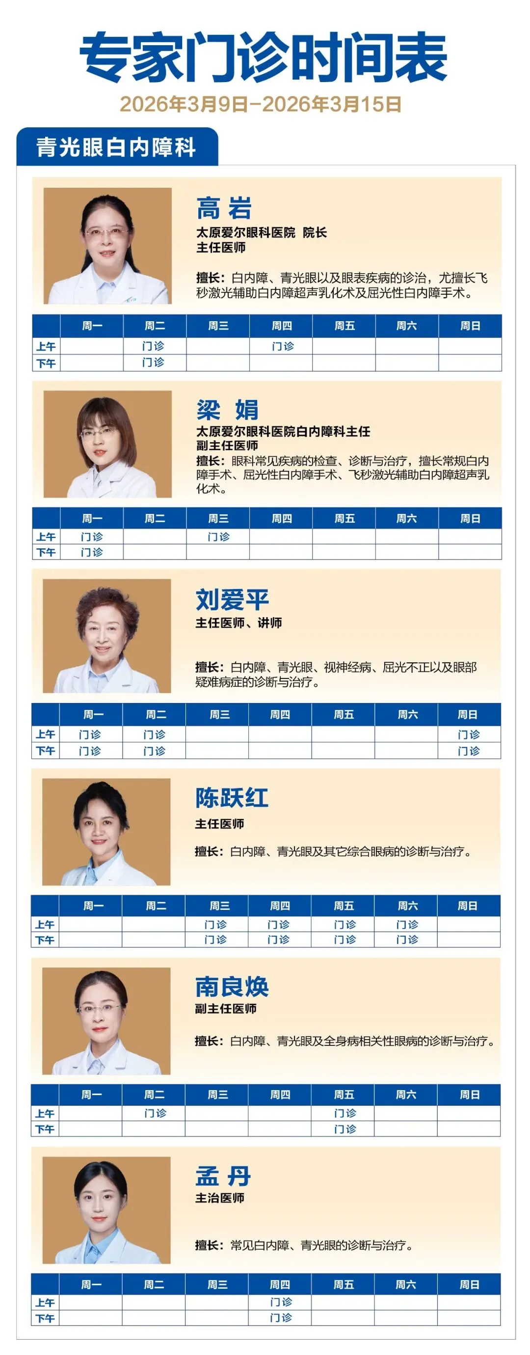 太原爱尔眼科医院2026年3月9日—2026年3月15日门诊排班表
