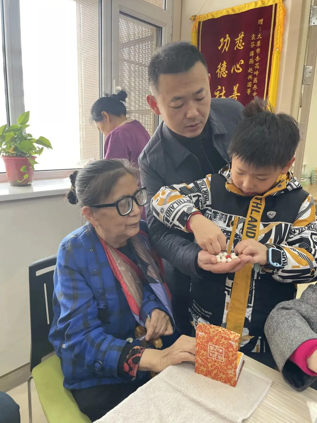 活动过程中,指尖的温度传递在一颗颗珠子之间,欢声笑语回荡在活动现场,原本普通的菩提与朱砂,在大家的巧手下,渐渐变成了一串串精致美观、寓意美好的手串。一位奶奶捧着自己亲手制作的手串,脸上洋溢着幸福的笑容:“这辈子还没亲手做过这样的手串,菩提护平安,朱砂添福气,这个节日过得太有意义了,谢谢大家对我们的关心!”简单的话语,道出了老人们心中的喜悦与感动,也感受到了志愿者陪伴的意义。