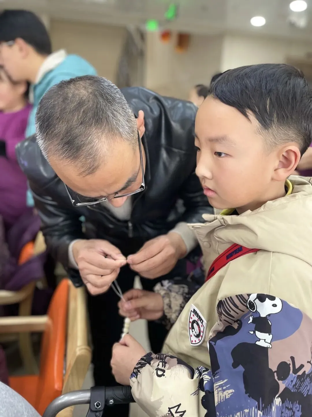 活动现场,暖意浓浓,欢声笑语不断。志愿者们提前精心筹备,备好圆润饱满的菩提子、色泽鲜亮的朱砂配饰、弹力绳以及剪刀、引线等工具,工作人员与志愿者们分组围在老年长辈身边,耐心讲解手串的制作步骤,穿菩提子、搭配朱砂打结,每一个环节都细致指导、手把手帮助。针对行动不便的老人,志愿者们主动上前,轻轻握住他们的手,一同穿珠引线,陪着他们慢慢创作,不放过任何一个小细节,力求让每位老人都能拥有属于自己的专属手串。