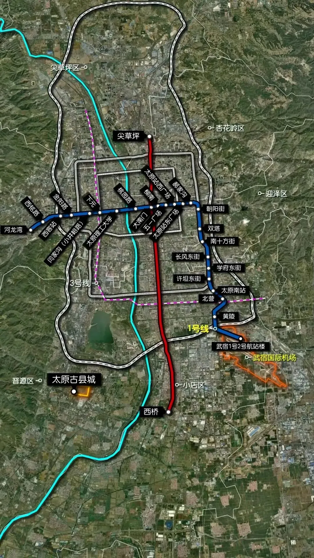太原地铁1号线起于汾河西岸旧矿区的河龙湾站,