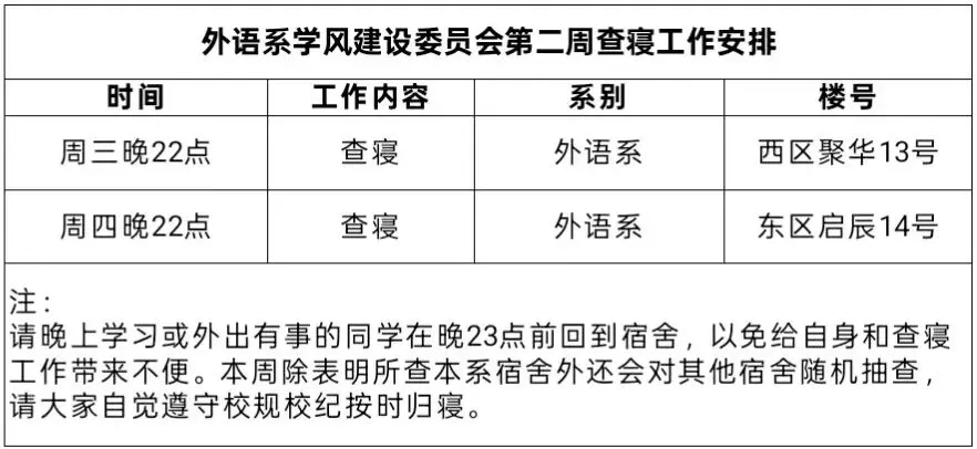 外语系学风建设委员会第二周协助老师查课查寝安排如下: