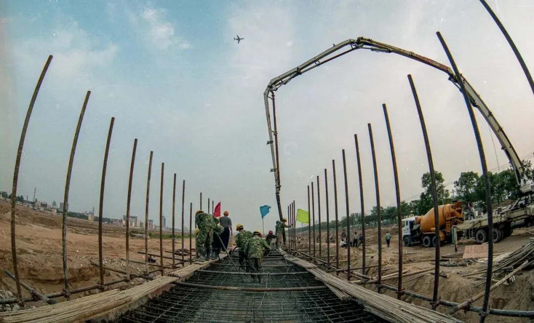 1999年6月4日,我在拍桥的路上,遇到汾河下面正在施工,便下到工地。用尼康FM2+鱼眼镜头,拍下了这张照片;恰巧天空飞过一架飞机,为照片添加了一点情趣。