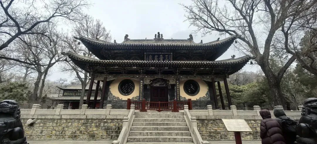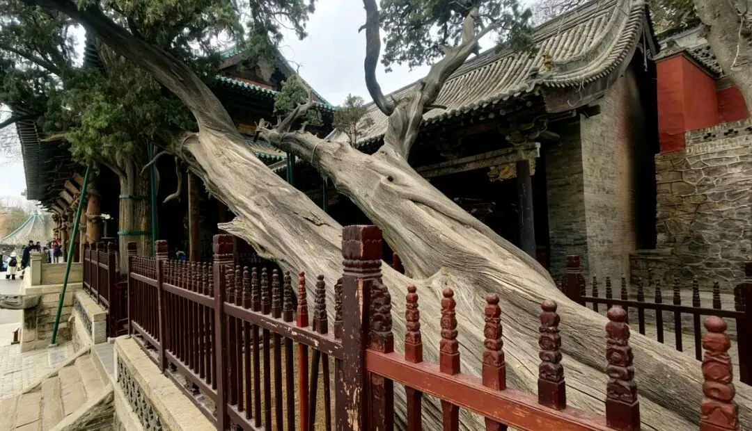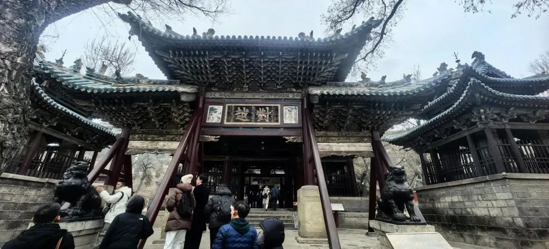 离开圣母殿,目光便被殿北的周柏牢牢吸引。这棵已过三千年的古树,树皮沟壑纵横,向南倾斜45度生长,由擎天柏支撑着,形似卧龙,得名“卧龙柏”。经碳14测定,它的树龄早于太原建城四百多年。冬日的枝桠间,依旧透着翠绿,那是时光沉淀出的磅礴生命力。