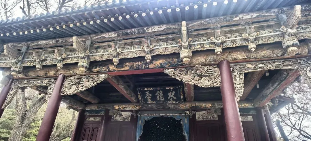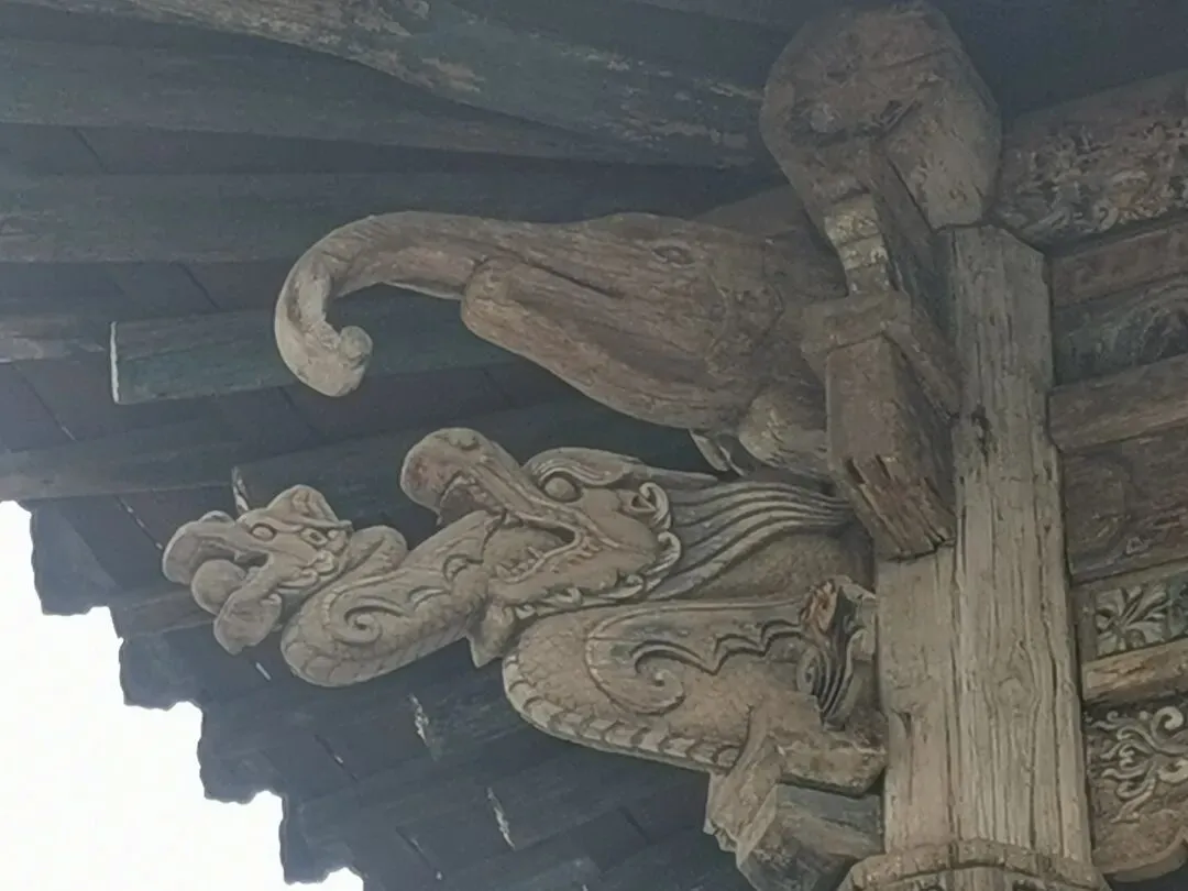 更奇的是它的双面构造:正面是重檐歇山,气势磅礴;绕到背面,却是单檐卷棚顶,造型精巧灵动,这便是清康熙年间修建的水镜台戏台。檐下挂着“晋祠三大名匾”之一的“水镜台”匾,字体飘逸,墨色虽淡,却见风骨。明代的彩绘与清代的木雕在此相融,不同时期的工艺,在一榫一卯间达成了完美的契合。四根垂莲柱如流苏倒垂,底部是向日葵的造型,上部是带翅膀的龙头鱼尾,细节精巧;拐角的飞檐下,木雕大象栩栩如生,寓意吉祥平安;大象下方的二龙戏珠更是匠心独运,大龙头吐小龙头,小龙头衔着宝珠,代代相承,藏着教育与传承的心意。
