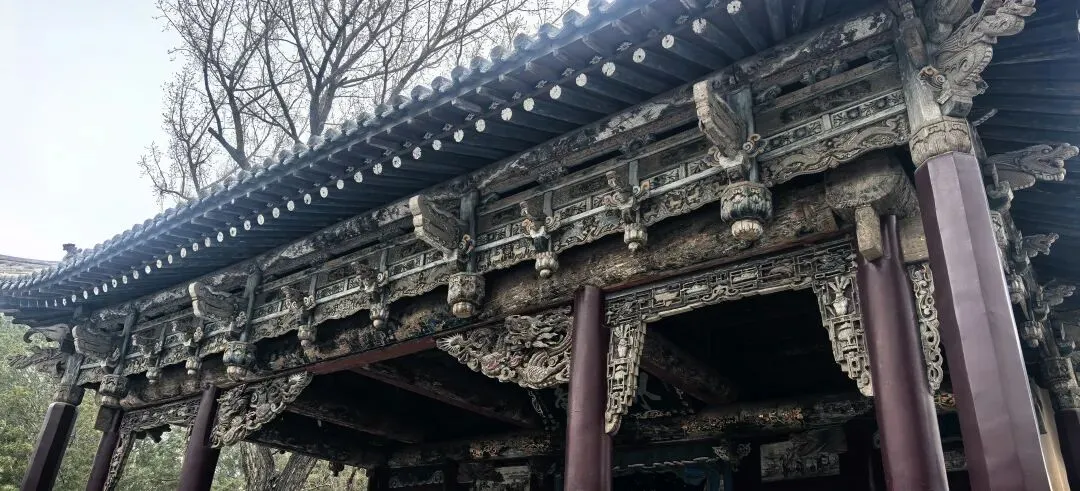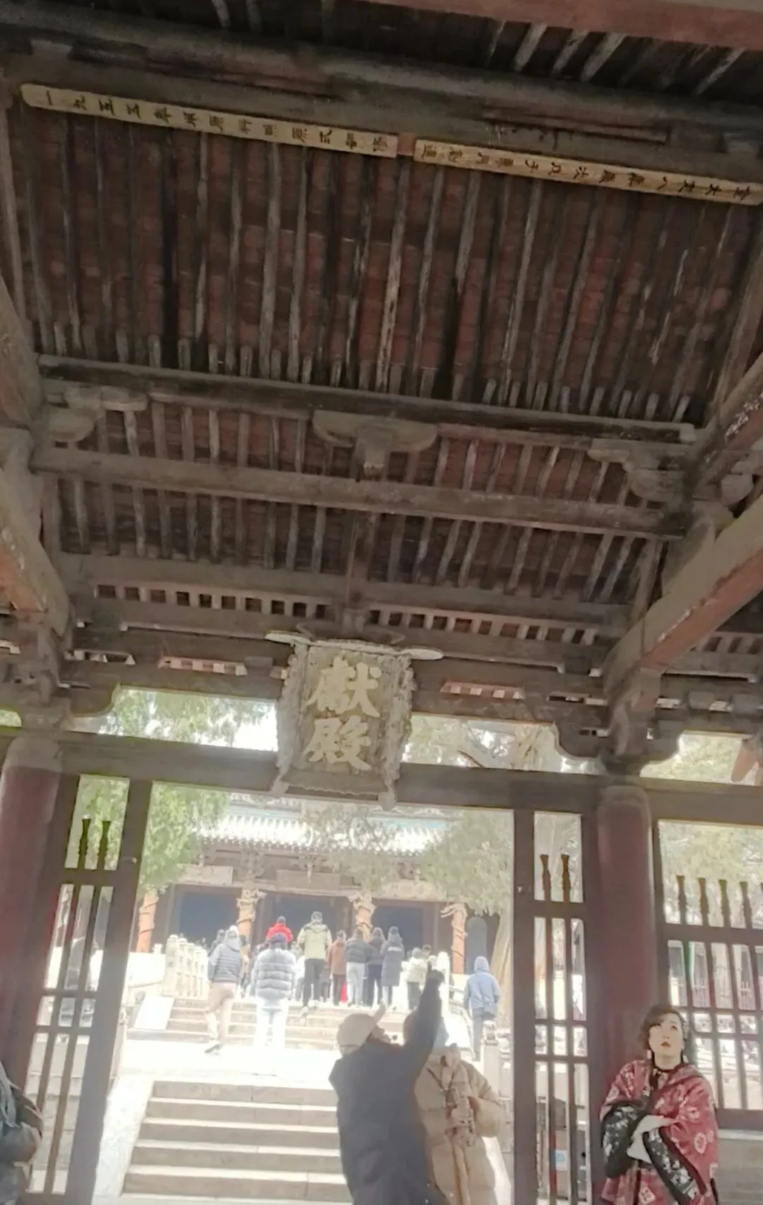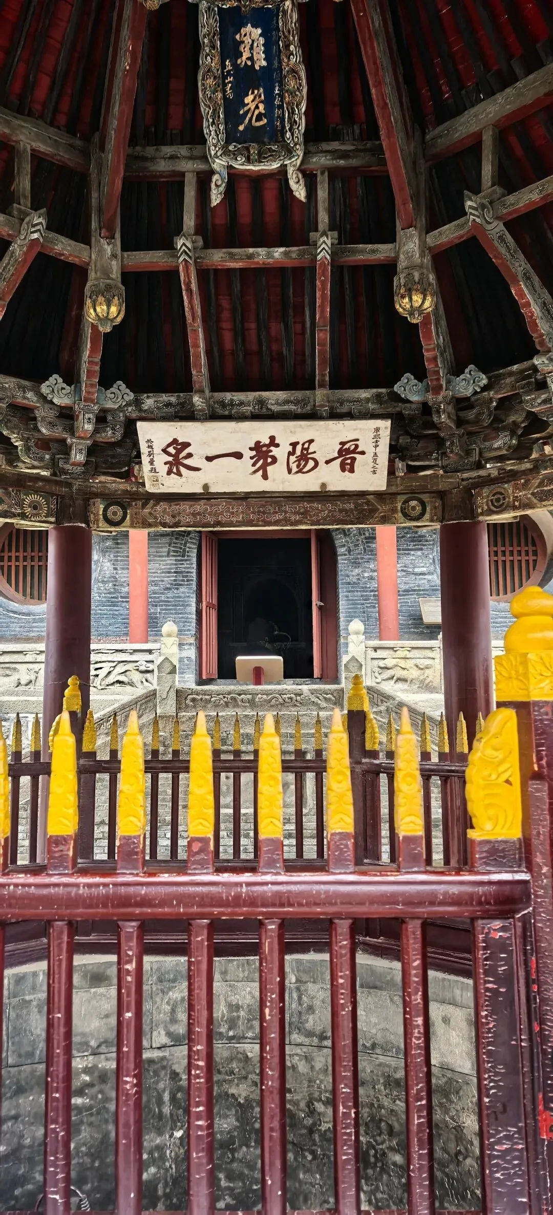 穿过对越坊,献殿便在眼前。这座晋祠三大国宝建筑之一,是金代祭祀圣母邑姜的专用享堂。出檐深远,翼角微翘,建筑整体大气又舒展。站在殿中,只觉设计格外通透实在:栅栏既能挡风挡尘,又能让凉风穿堂而过,保证空气流通。撑起屋顶的梁架没有多余的花哨设计,简单却无比稳固,古人的智慧,便藏在这朴实的匠心之中。