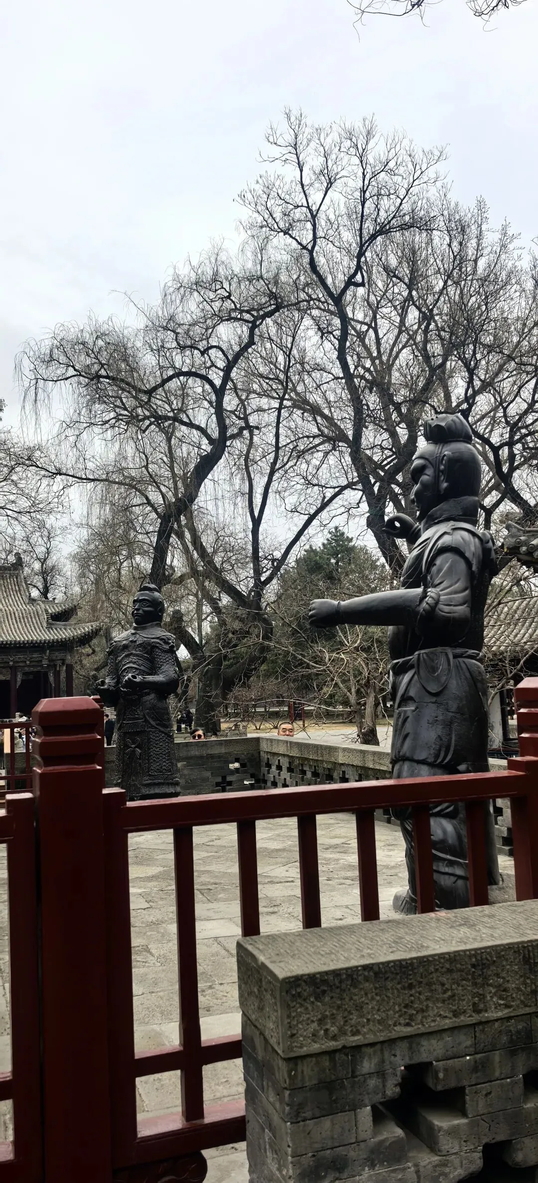 穿过临水小亭,便到了金人台。台基的四角,四尊铁人静静伫立。三尊是北宋原物,铸造于绍圣年间,铁人身形挺拔,面部轮廓清晰,雕纹细腻;唯有东北角那尊,是原物遗失后民国时期重铸的,线条粗糙。原本金人手中都握着兵器,如今早已损毁,只留空落落的拳握。宋代的精致与民国的粗糙,就这样直观地摆在眼前。