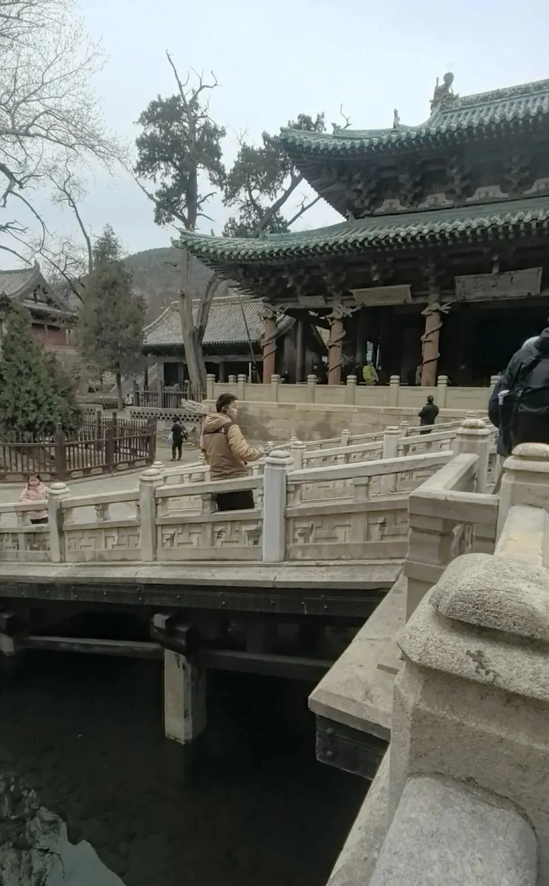 走过献殿,鱼沼飞梁横空而立。这座十字形古桥,与圣母殿同建于北宋年间,已有千年历史。古人以圆为池,以方为沼,因沼中多鱼,故称鱼沼;架起的十字形桥梁,便是飞梁。沼内立着三十四根小八角形石柱,柱顶架着斗拱和枕梁,稳稳承托着十字形桥面,被誉为“世界上最早的立交桥”,在中国现存古桥梁中,是绝无仅有的孤例。桥两侧的北宋铁狮子,直毛昂扬,静静守护着这座独特的建筑奇观。