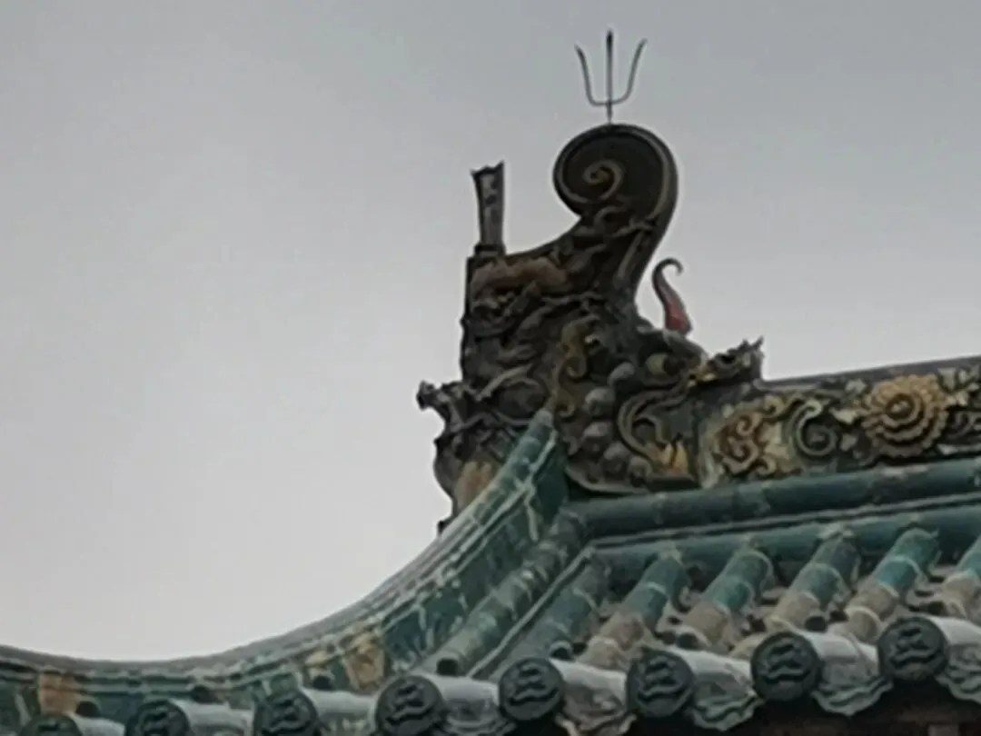 圣母殿是重檐歇山顶,屋顶覆盖着黄绿色琉璃剪边,色彩温润。正脊两端的鸱吻(鸱尾),是明代重修时添配的。屋顶正中的三叉戟状金属宝剑,兼具镇火避灾的寓意。