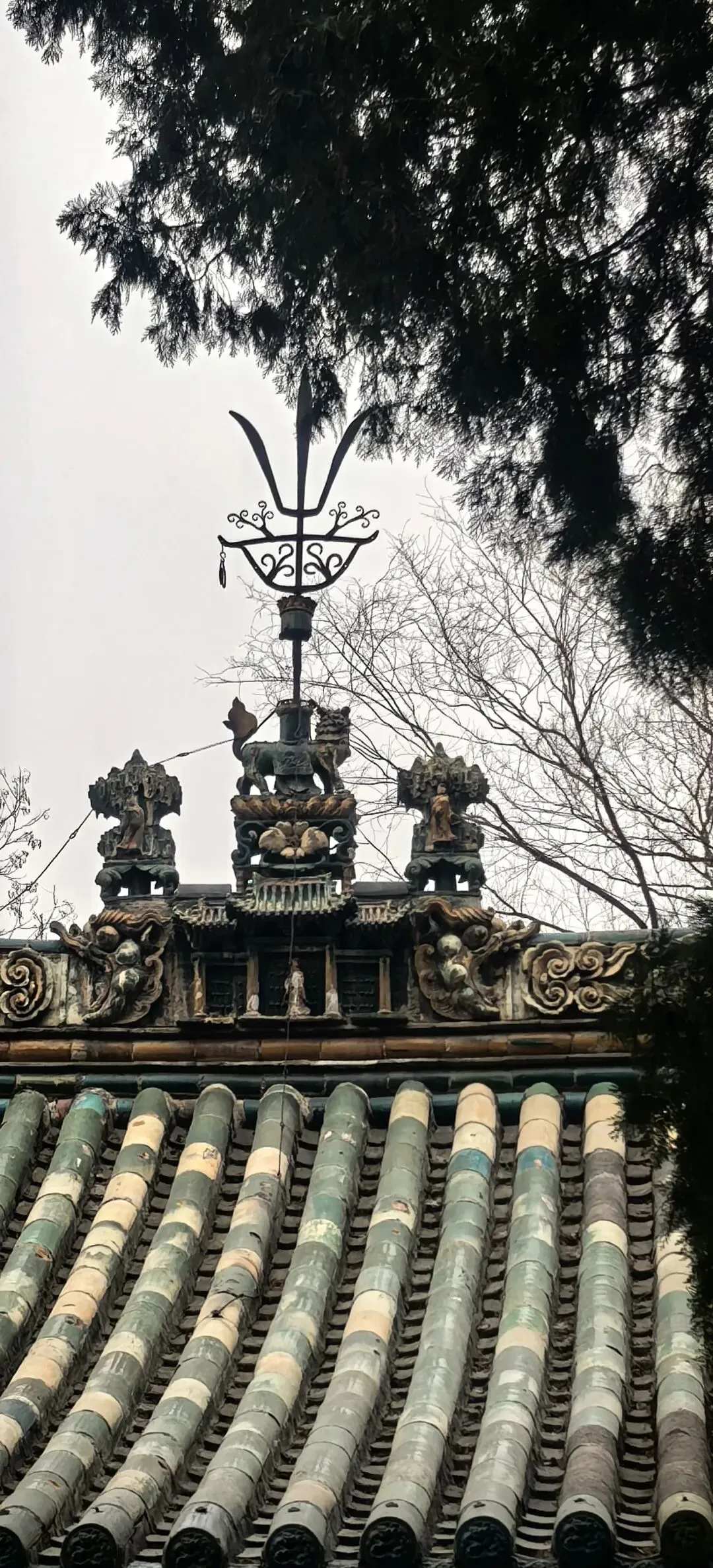 继续向前,对越坊赫然立在眼前。这座明万历四年修建的木质牌坊,斗拱层层叠叠,繁复如花朵绽放,既稳稳支撑着巨大的屋檐,又透着极致的力量感。屋顶的琉璃构件虽经岁月侵蚀,却依旧闪耀,仿佛能想见当年的富丽堂皇。坊前的一对北宋铁狮子,壮实健硕,与明代的铁狮遥遥相望,新旧相映,时光流转。