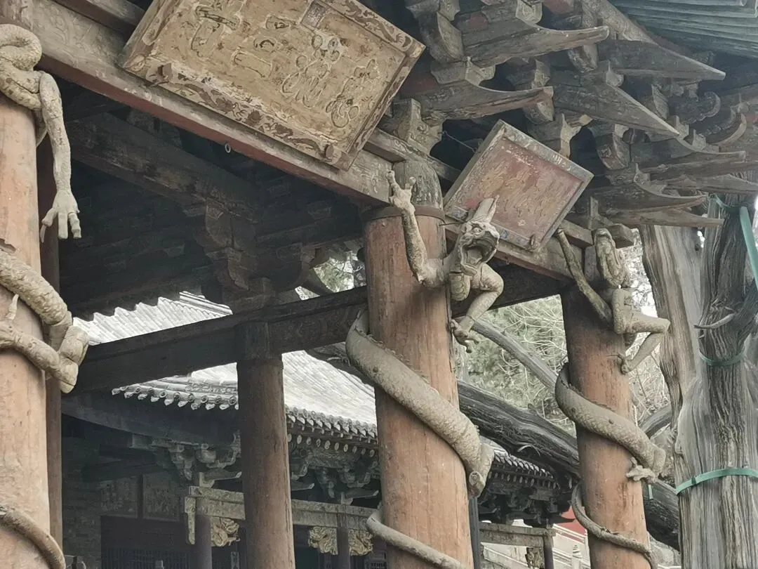 屋檐下的斗拱舒展大气,采用减柱营造法,仅靠外檐的梁柱承托屋顶,让殿内的空间异常开阔。殿前的八根廊柱,是中国现存最早的木雕盘龙柱。鳞爪遒劲,龙目含威,木色沉厚如铁,是北宋匠人留在柱上的气魄,龙身姿态各异,比耶龙和点赞龙,引得游客纷纷驻足打卡,千年古物,在今日依旧鲜活。