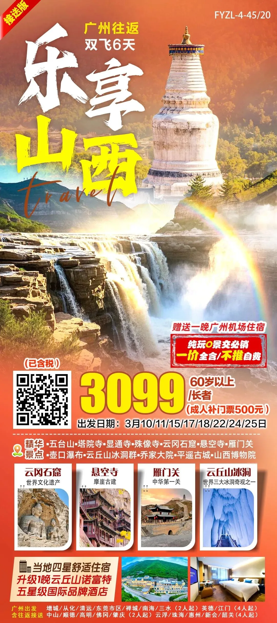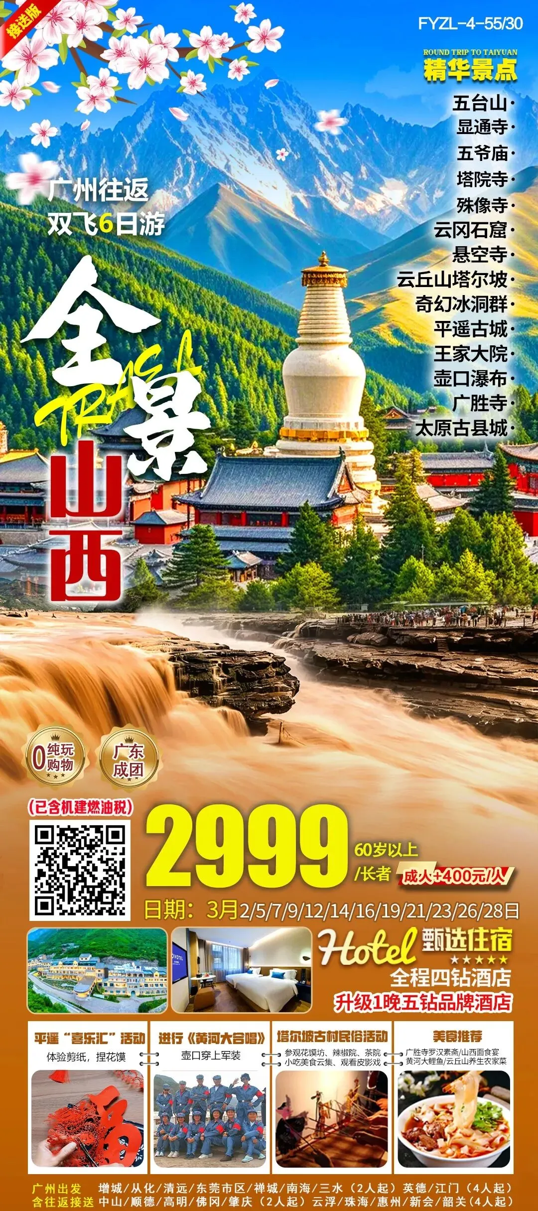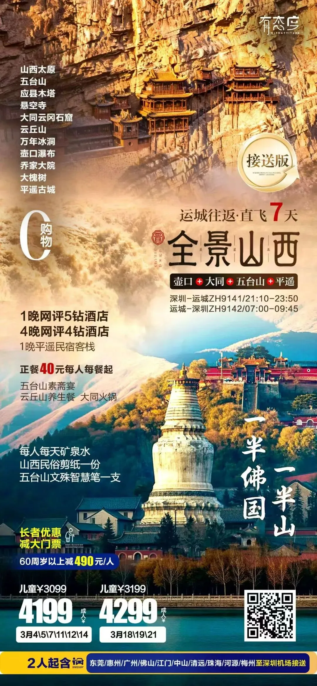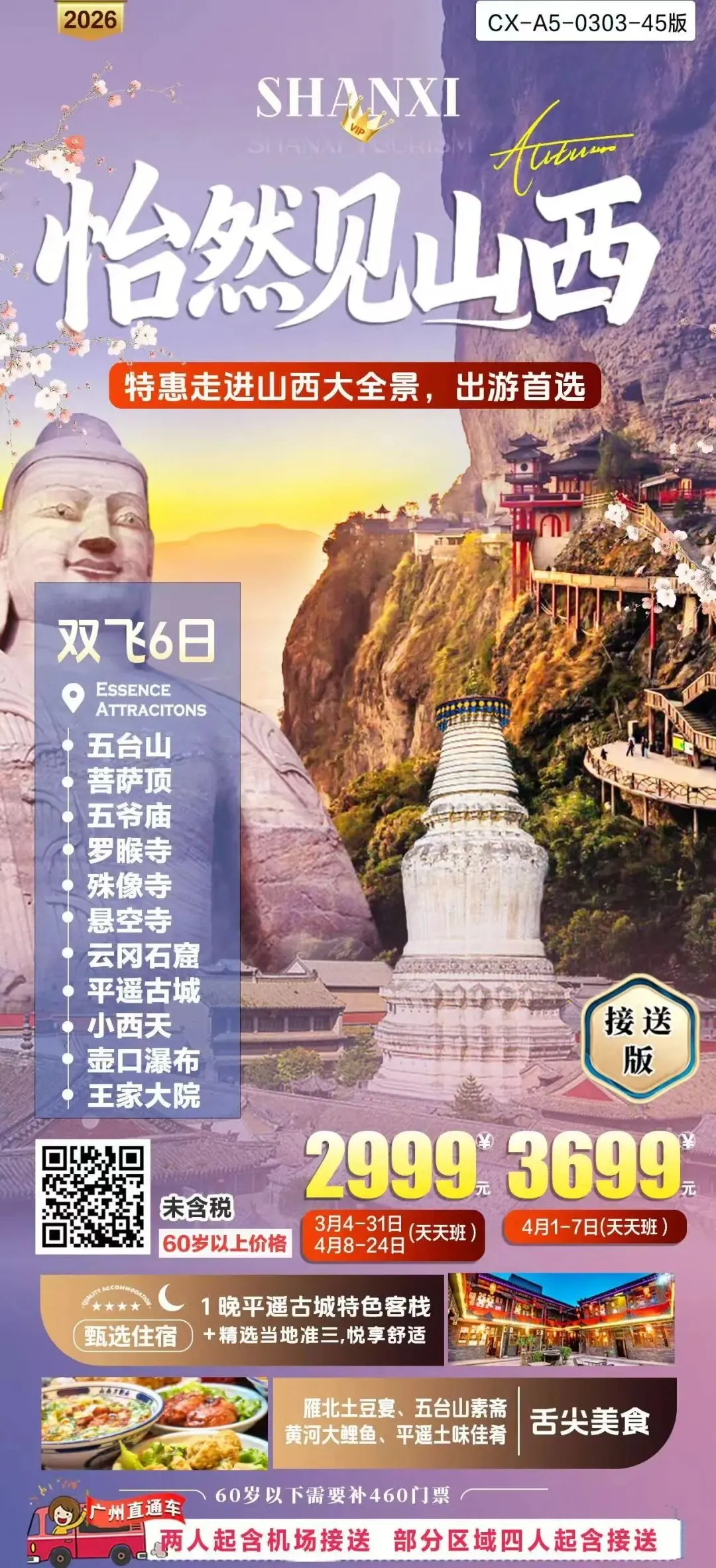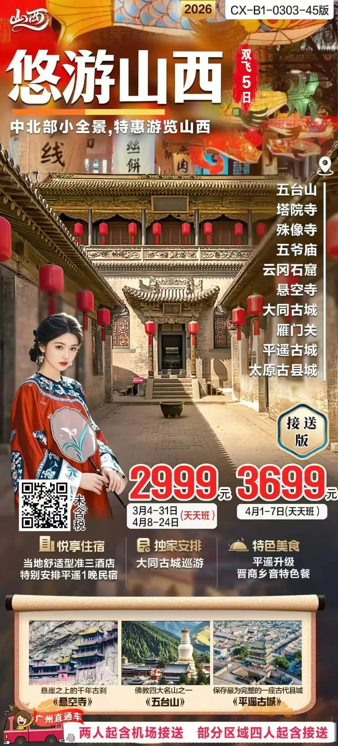 山西/太原滑雪场/五台山/平遥古城/乔家大院/云冈石窟/悬空寺