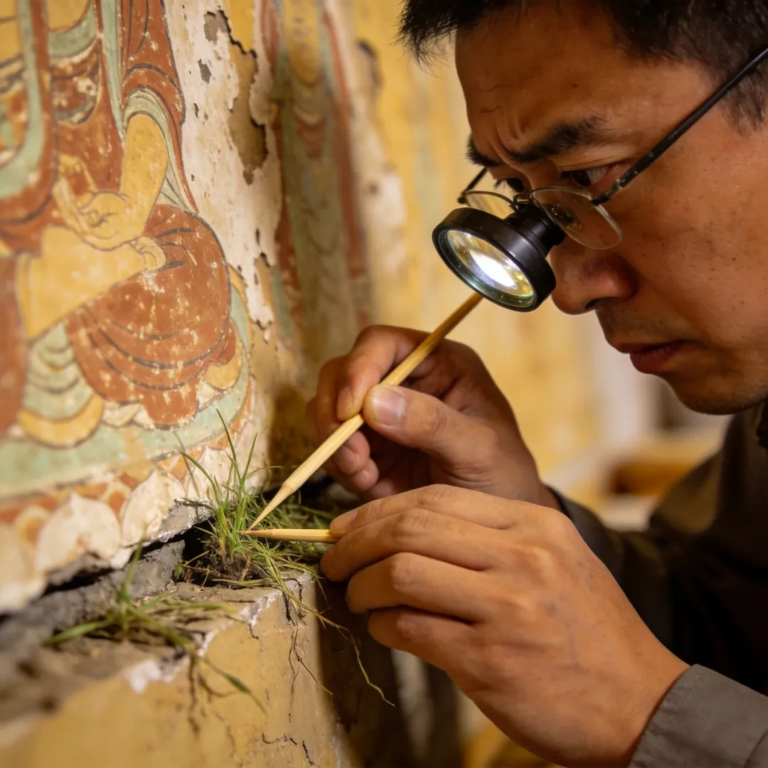 墓道壁画的白灰层只有1毫米厚,比鸡蛋壳还脆。修复师拿软竹签一点点抠杂草,用针管注射黏结剂,一次只处理指甲盖大小的地方。看得我屏住呼吸——这哪是修画,分明是给壁画做心脏搭桥。