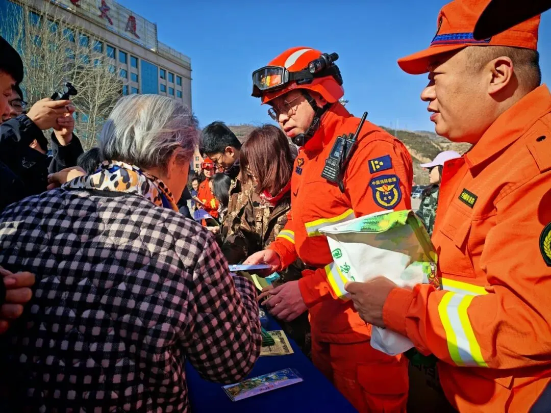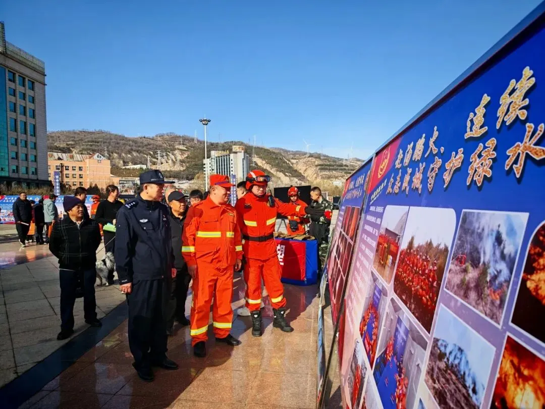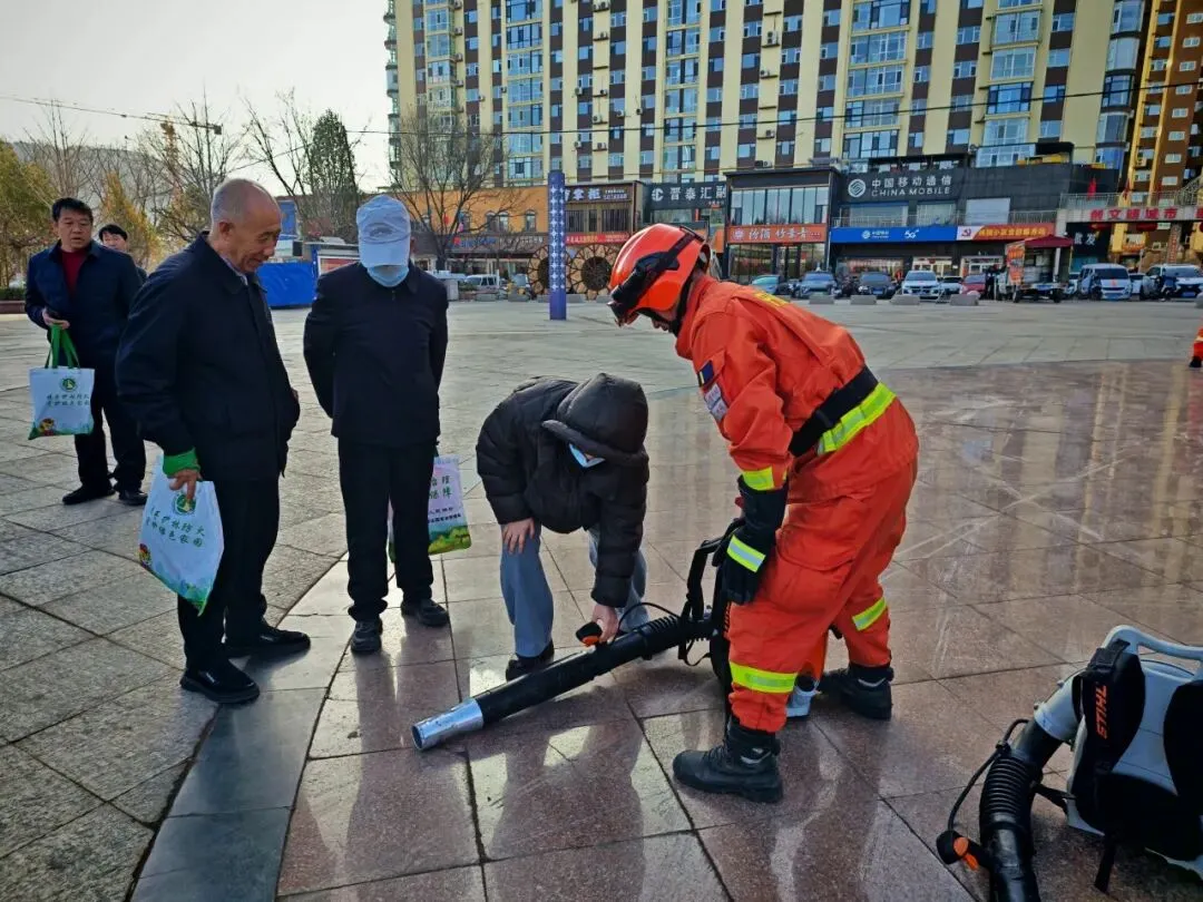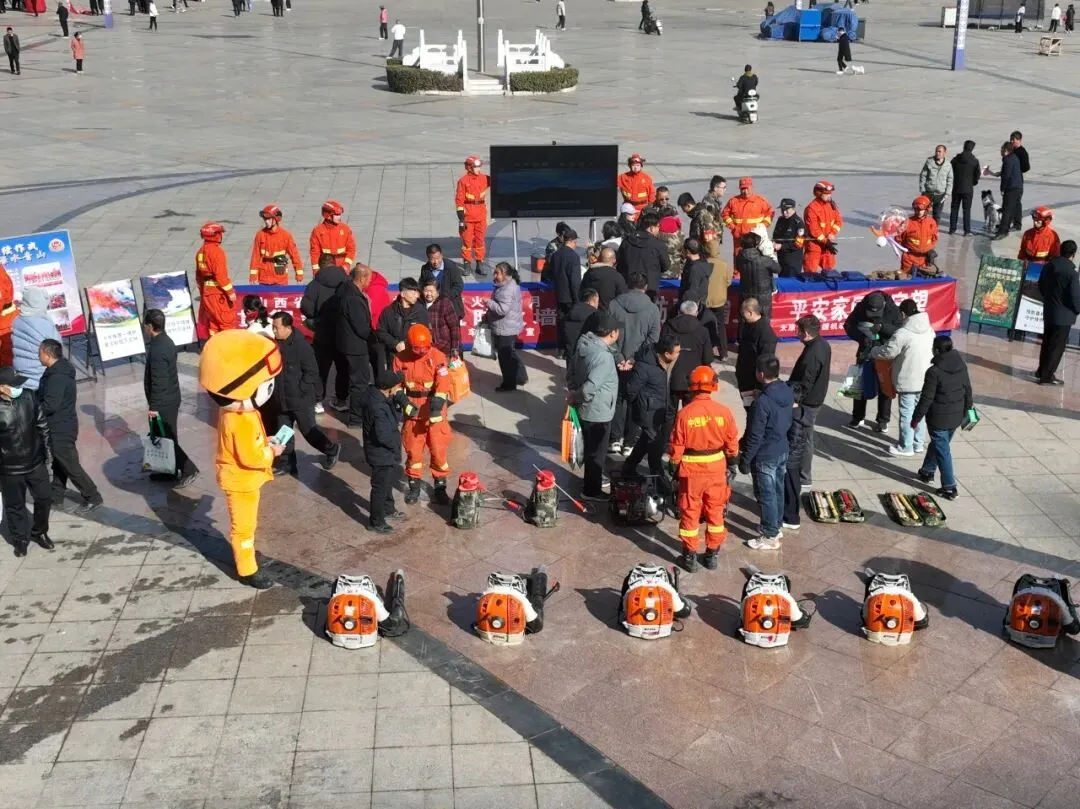 中阳县中兴广场,大队设立的宣传点装备整齐排列,引人注目。指战员们现场详细介绍了风力灭火机、油锯等主战装备的性能与用途,并特别设置了互动体验环节,邀请群众亲身背起机具,在切身体验中加深对森林消防工作的理解。活动现场,通过展板展示了队伍发展历程与林火扑救方法,循环播放的防火公益宣传片直观展现了火灾的严重危害。同时,大队指战员与林场及森林公安工作人员一同,向过往群众发放宣传单,耐心讲解防火法规、普及避险常识,将“森林防火,人人有责”的理念播撒进群众心田。