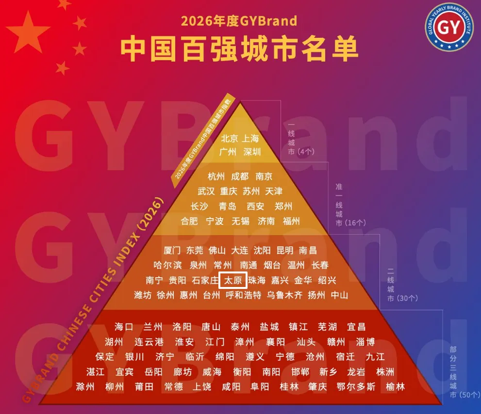 近日,GYBrand(专业品牌估值与增长咨询公司——格勒博意利)发布了全国百强城市综合实力排名,太原排在了38位,位列二线城市,与石家庄、珠海等城市同列,比去年的40位前进了两位。