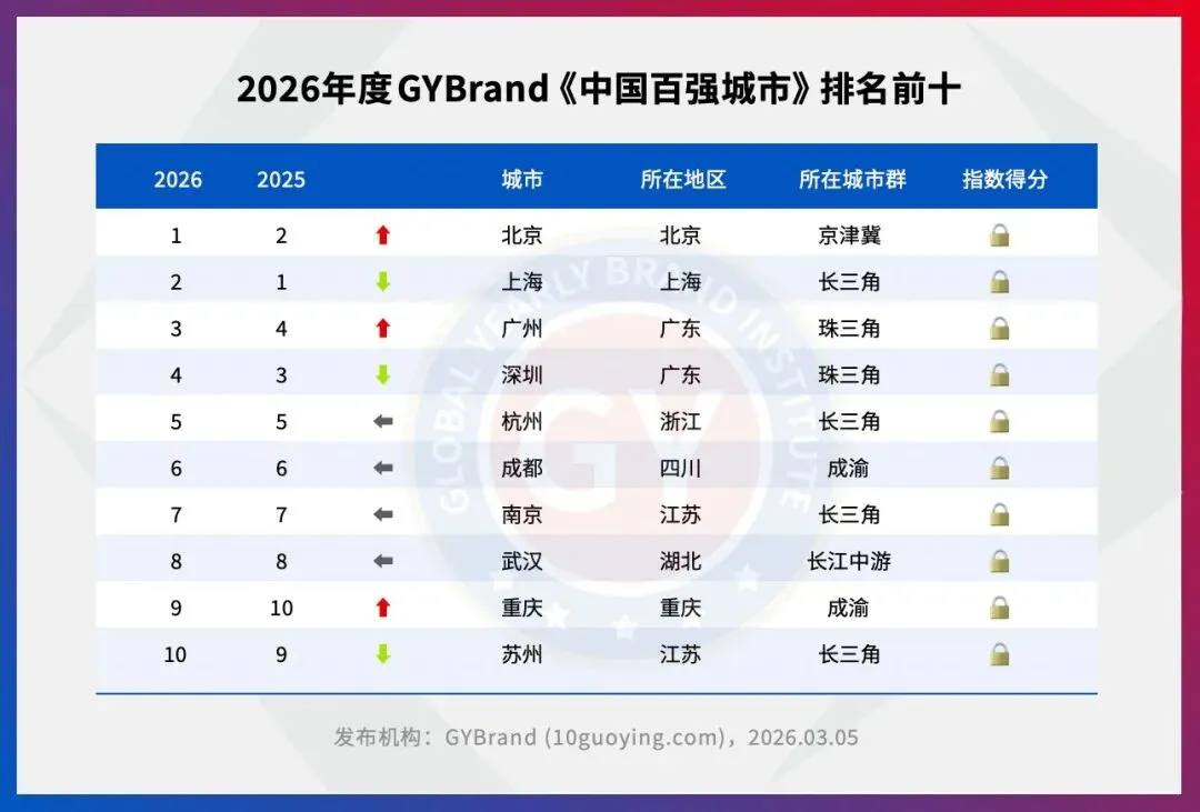 本次排名评估方法:GYBand独家编制的2026年度中国百强城市综合实力指数GCC),打破了传统GDP或人口总量排序逻辑,从经济实力、发展清力、基础设、治理效能、医教資源、文化交流、营商环境、创新活力、品牌引领、国际声誉等多个维度进行综合评估,全面展现中国城市高质量发展新格局。
