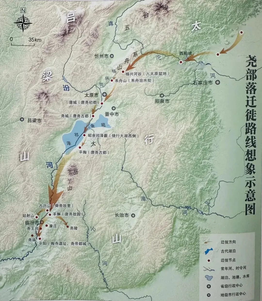 陶唐氏早期的活动中心位于河北保定唐县一带,当时这一地区水系密布(滹沱河、唐河等),气候湿润,但频繁的洪水泛滥(史称“汤汤洪水”)严重威胁了部族生存。为了躲避洪水,帝尧率领部族向西迁移。部族穿越太行山,渡过滹沱河,进入了山西境内的太原盆地,这里土地肥沃,气候相对温和,部族在此停留并建立据点。