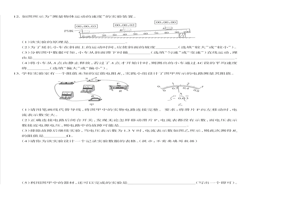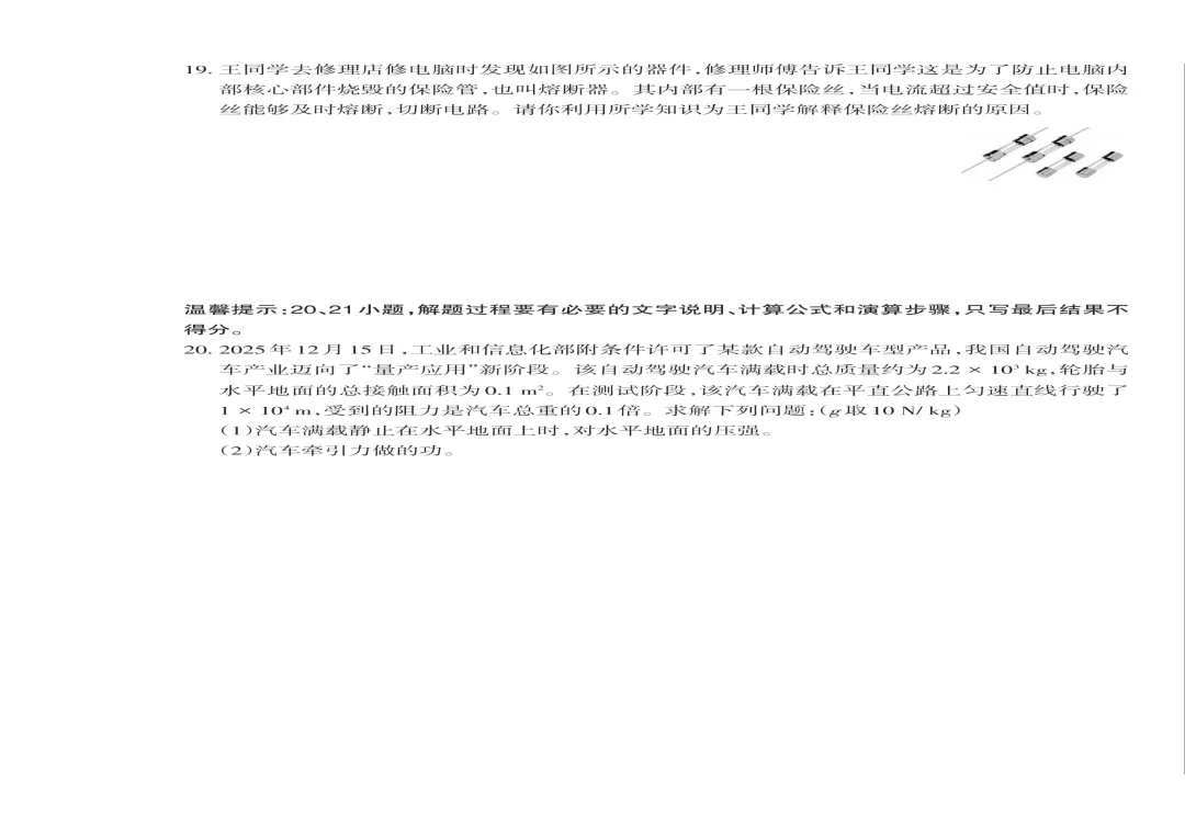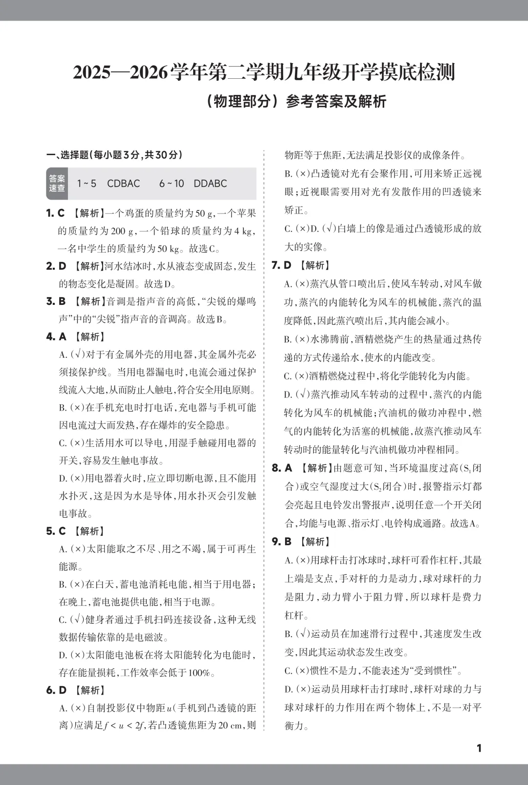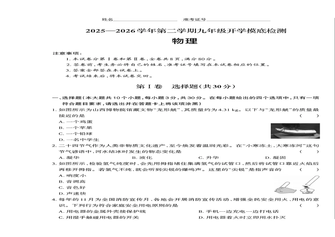 九年级物理:山西太原小店区2025-2026学年第二学期九年级物理开学收心练习+答案分享