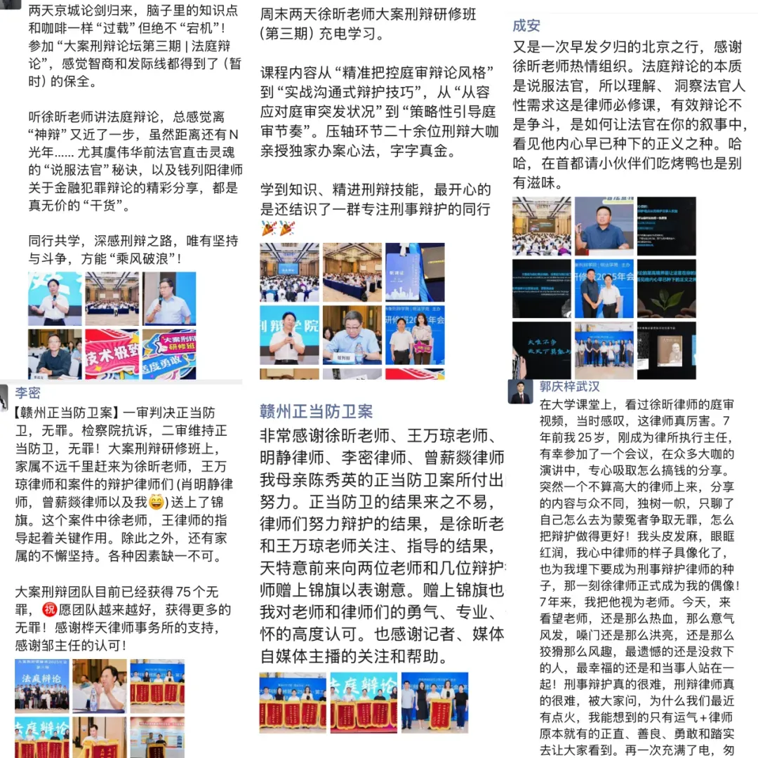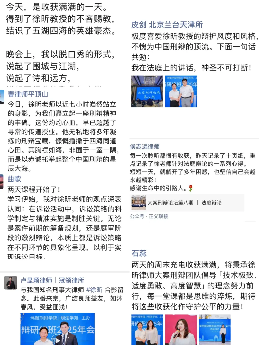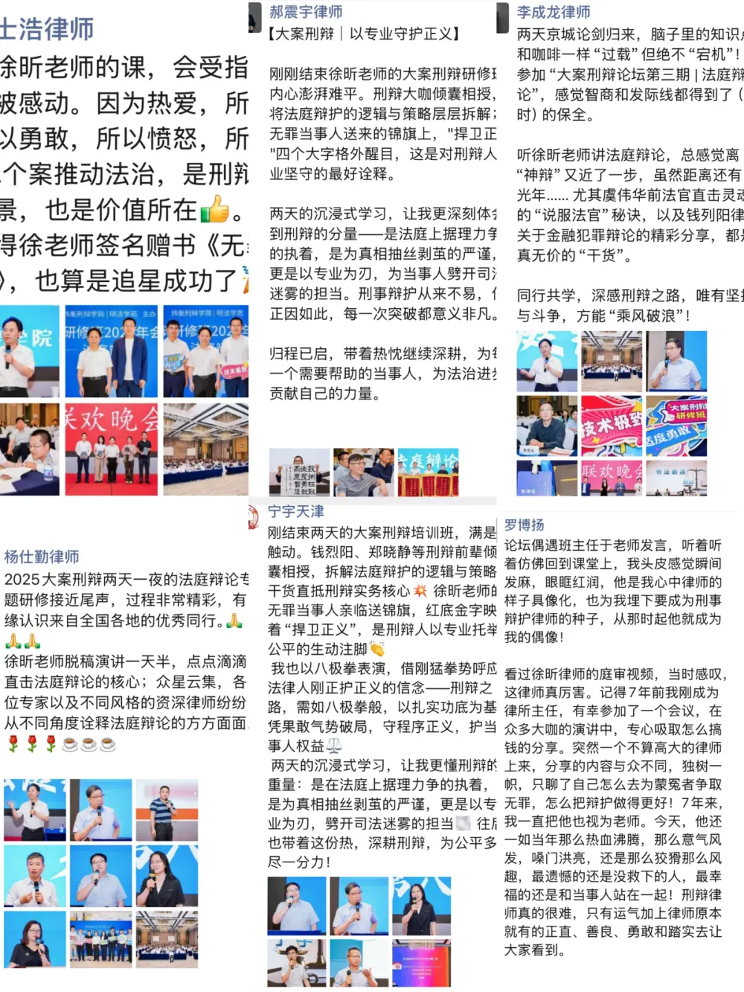 因此徐昕老师开设线下课,并不仅仅为传递技巧,更是为了凝聚更多愿意投身刑事辩护的同行者,为中国刑辩行业培养更多优秀年轻律师,为坚守刑辩初心的同行搭建交流合作的机会。让愿意扎根刑辩、敢于较真碰硬、坚守法治信仰的律师们,碰撞出火花。