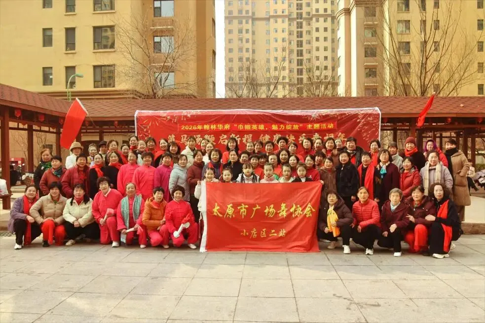 太原市广场舞协会小店区二站“巾帼绽芳华.奋进新时代”庆祝三八国际妇女节联谊活动,于2026年3月8日,在太原市农牧场社区翰林华府小区广场举办。主办单位:农牧场社区翰林华府物业,承办单位:太原市广场舞协会小店二站。2026-3-8.